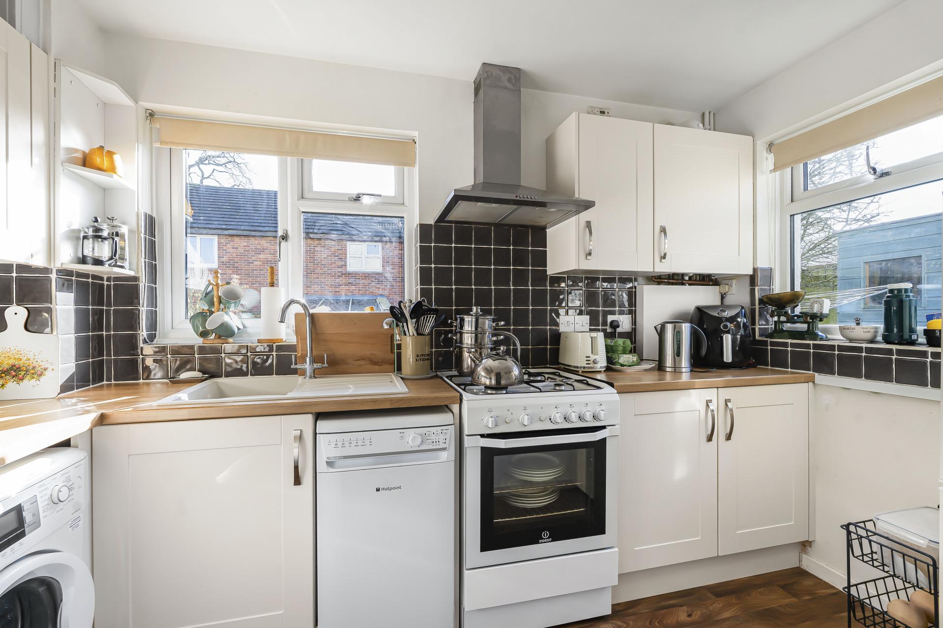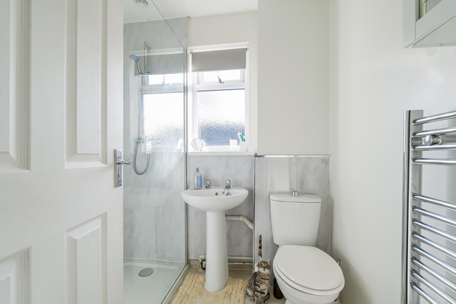 The modern fitted kitchen is positioned at the front of the property and is fitted with a range of wall and base units, ample worktop space and room for appliances. Dual aspect windows to the front and side allow for plenty of natural light and enjoy an outlook over the side garden, creating a bright and airy cooking space. Upstairs, there are two generously sized bedrooms. The principal bedroom overlooks the rear garden and includes built in wardrobes and a further well-proportioned second bedroom. The shower room is fitted with a contemporary suite comprising a walk-in shower, wash hand basin and WC.