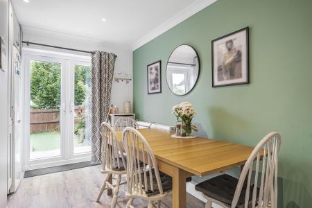 Step into a welcoming entrance hall with access to a convenient downstairs WC, leading through to a stunning open-plan kitchen, dining, and living area. The vendors have reconfigured the layout by removing a partition wall, creating an elegant open-plan living space that seamlessly combines light, flow, and functionality. The modern fitted Howden's kitchen features shaker-style units, integrated appliances include a built-in double oven, gas hob, dishwasher and microwave, and a stylish breakfast bar with LED lighting. This sociable space is bathed in natural light thanks to dual aspect windows and double patio doors that open onto the rear garden, perfect for everyday living and entertaining.