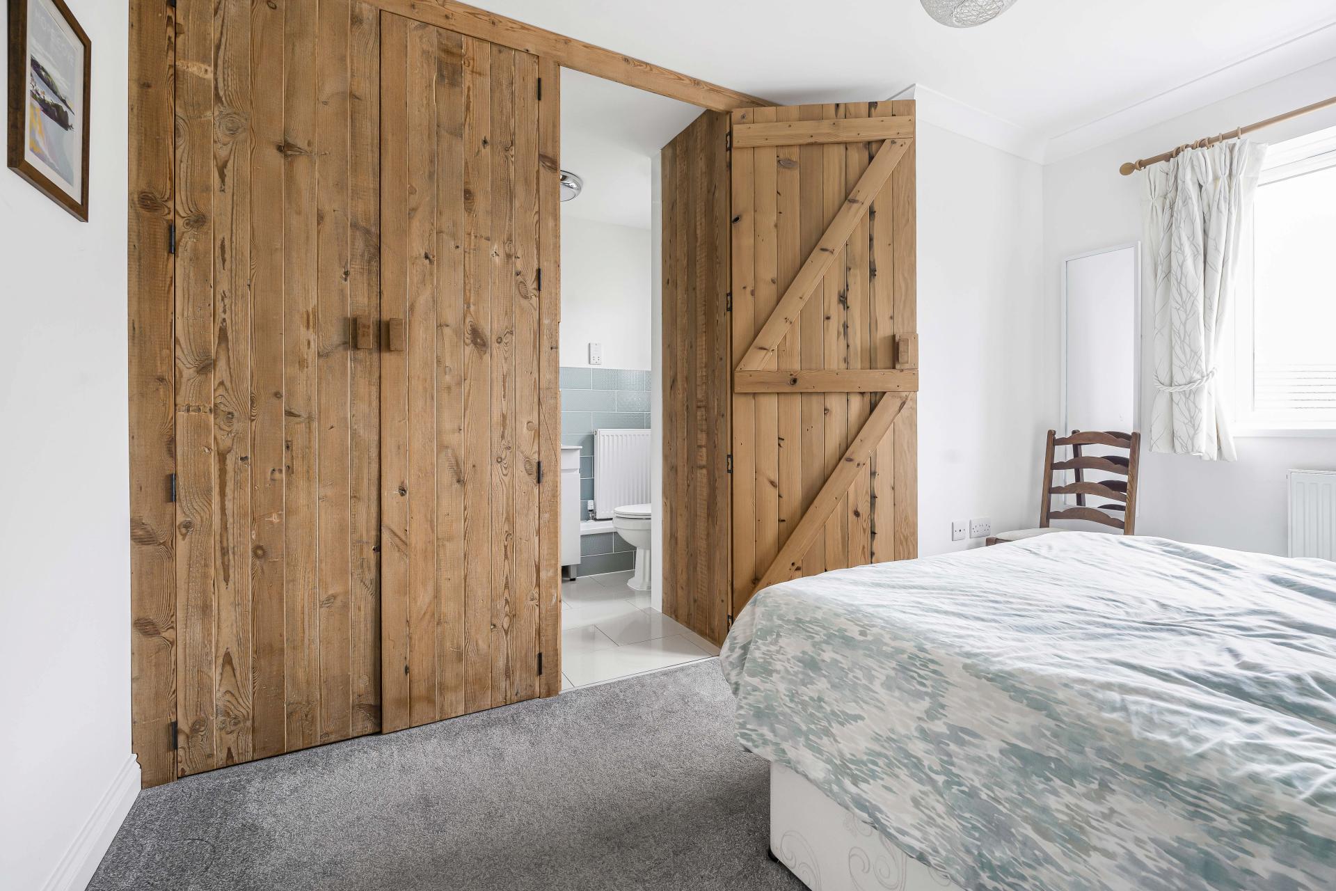 Upstairs, the first floor offers two spacious double bedrooms, including one with a hidden en-suite shower room for added privacy and style. A modern family bathroom serves this floor, and a cleverly designed utility cupboard on the landing provides a dedicated space for laundry and additional storage.
