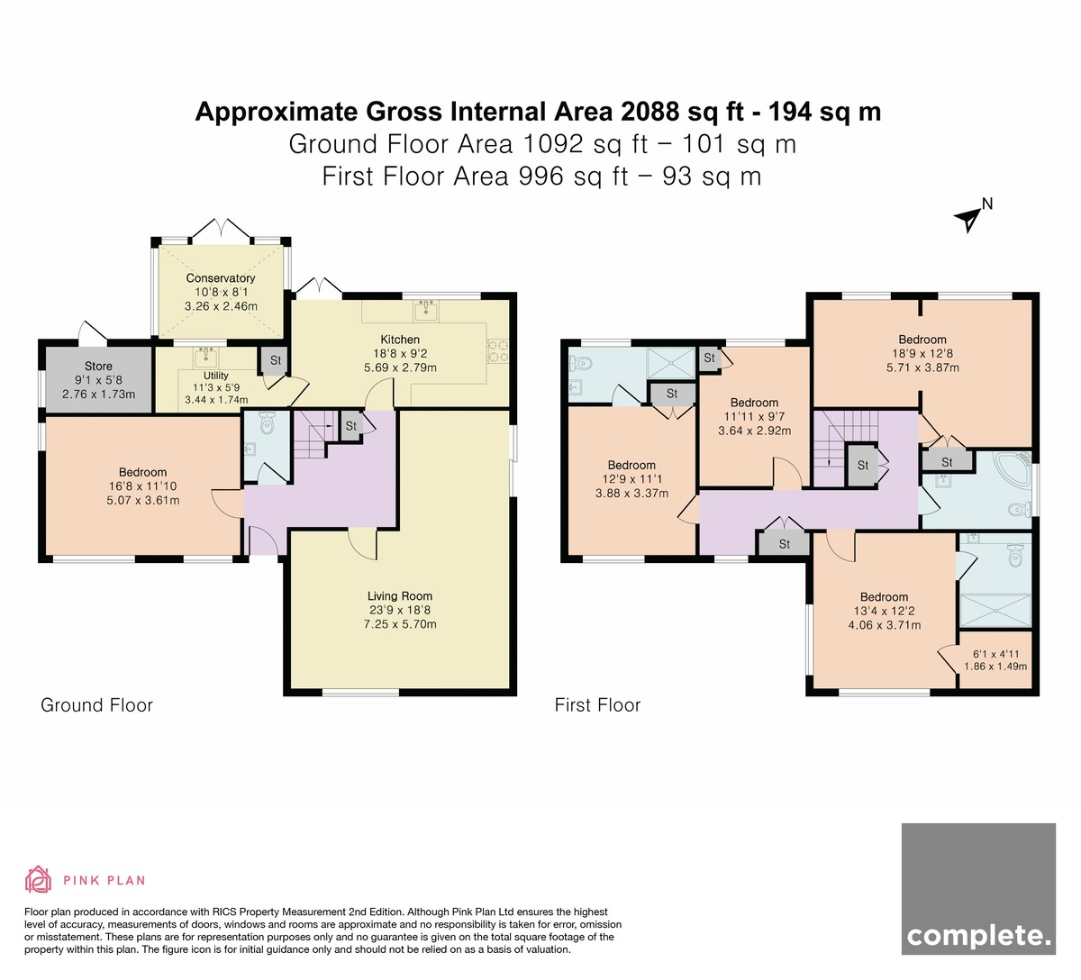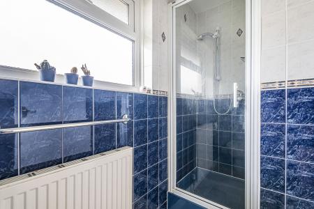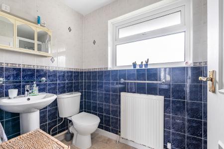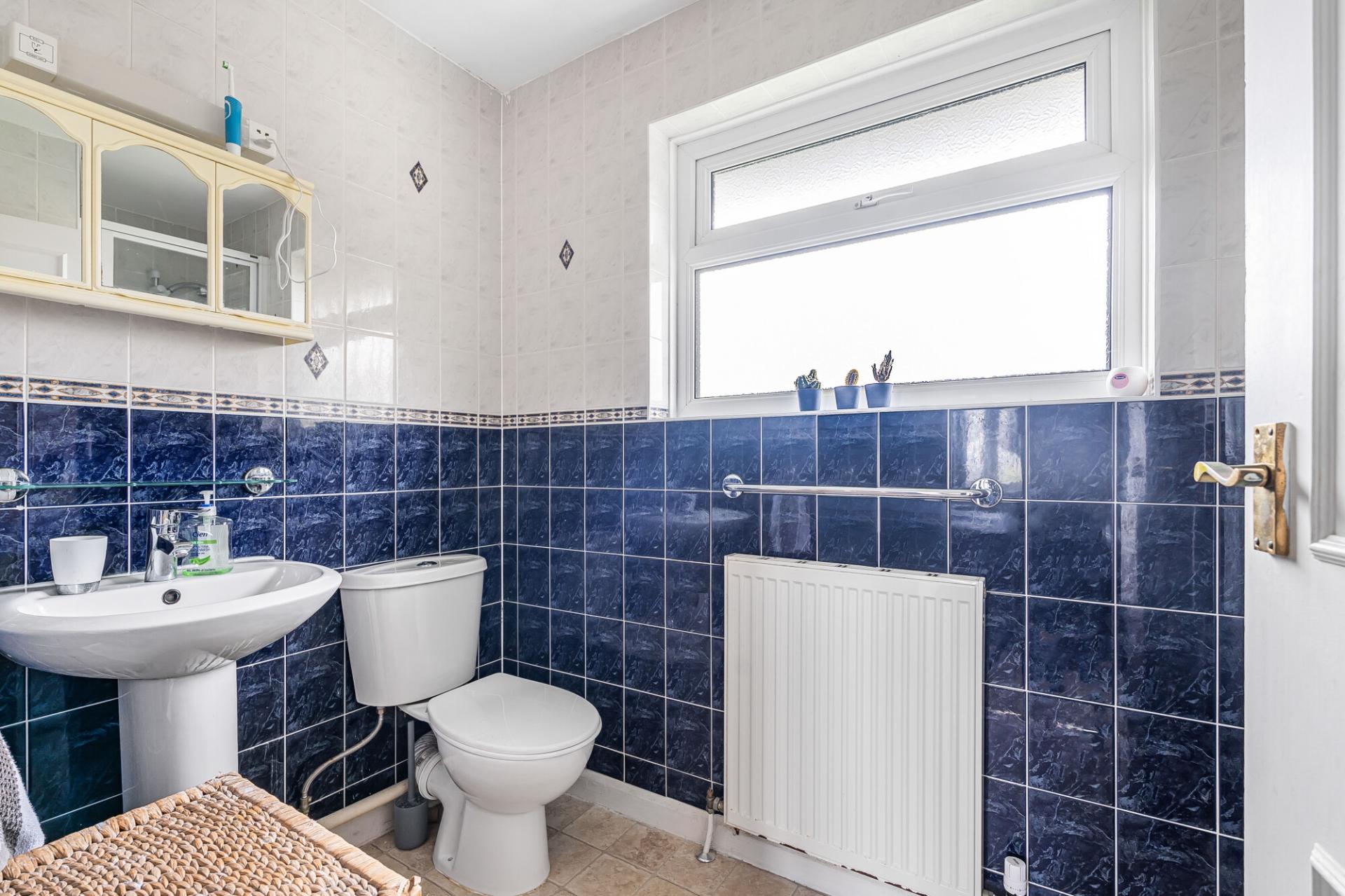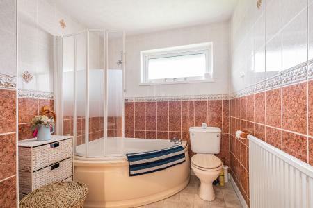 A fully tiled family bathroom completes the upper level, fitted with a corner bath with shower over, pedestal basin, and WC.