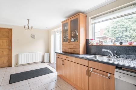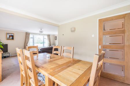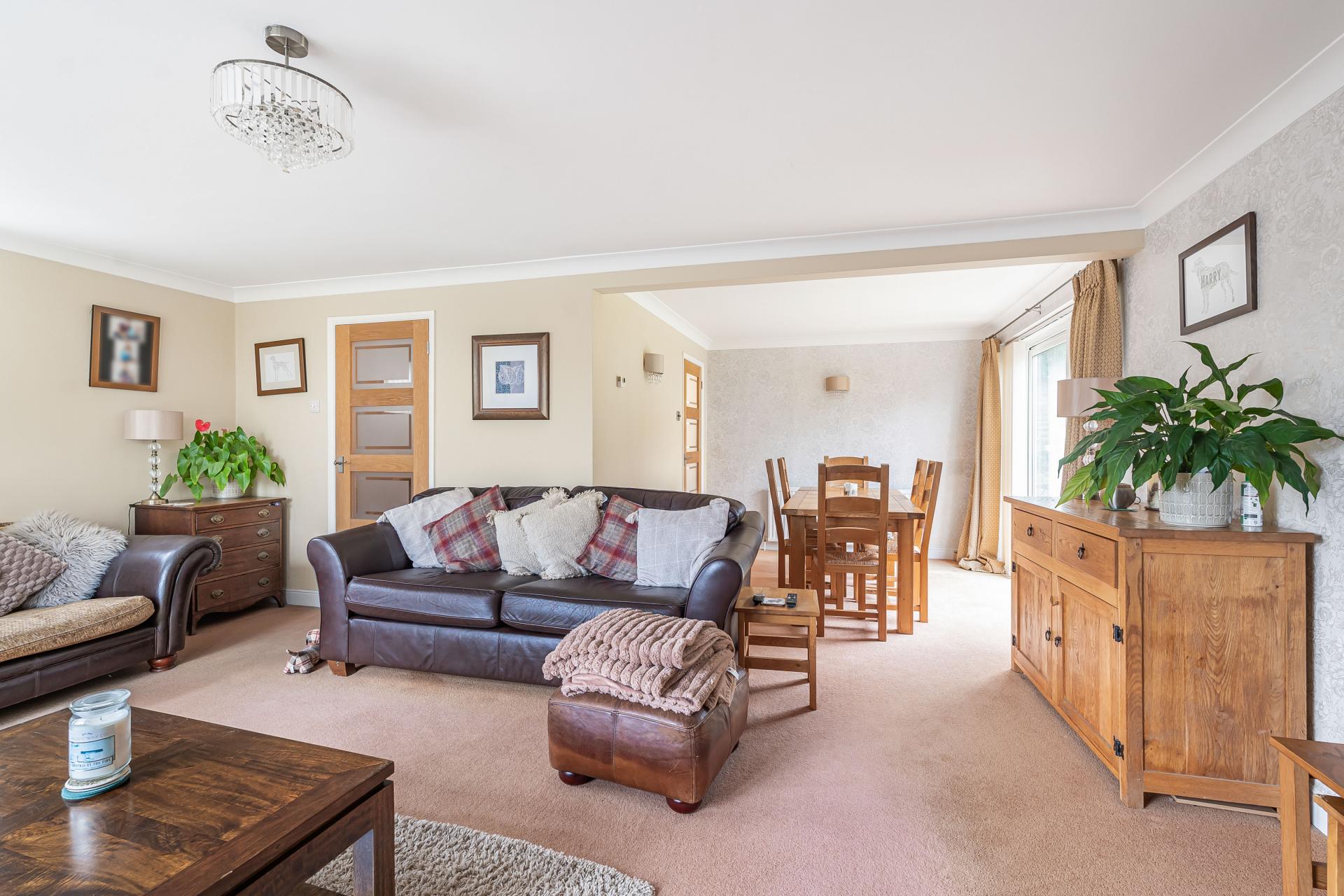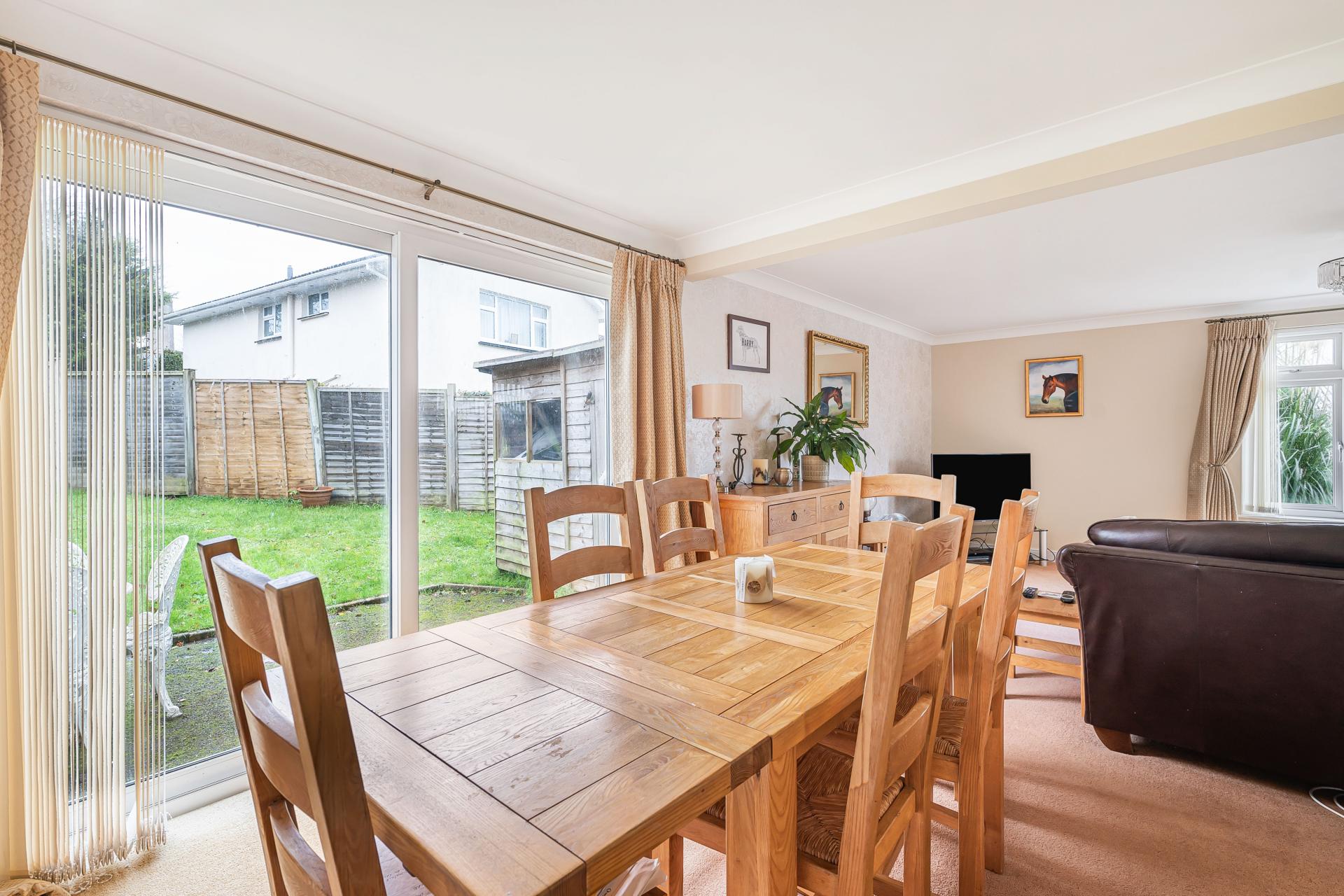 The property features two generous reception rooms. The principal lounge/dining room enjoys a bright double-aspect outlook, with a large front facing window and sliding patio doors opening directly to the garden perfect for indoor outdoor living and family gatherings.