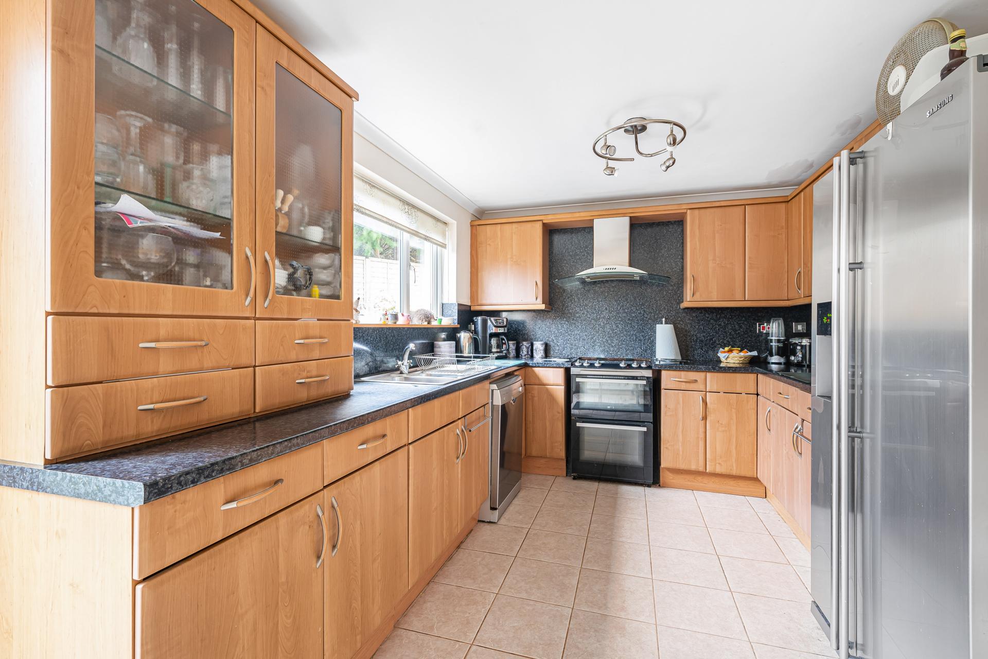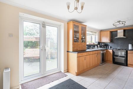 The modern kitchen/breakfast room is a standout feature well proportioned and clearly zoned to offer dedicated cooking and dining areas. The kitchen is fitted with an excellent selection of wall and base units with work surfaces, an inset sink, and a picture window overlooking the garden. There is space for a range-style cooker with extractor, a dishwasher, and an American style fridge freezer. The dining area comfortably accommodates a breakfast or small dining suite and enjoys French doors that open onto the garden, filling the space with natural light.