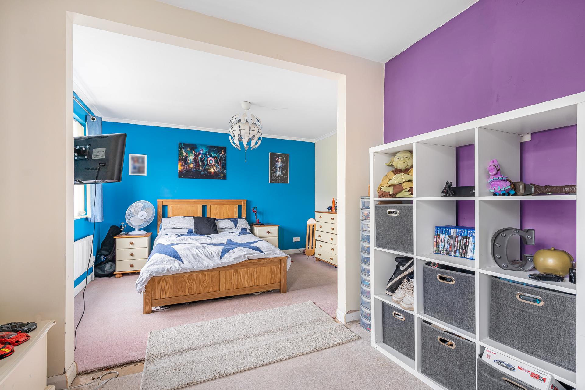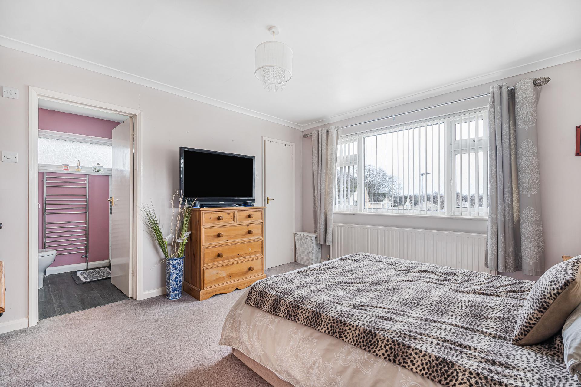 Upstairs, the principal bedroom is a notably spacious room, enhanced by a walk in wardrobe and a contemporary en-suite shower room. The en-suite features a double walk in shower, heated towel rail, high gloss vanity units with wash hand basin, and a concealed WC, creating a luxurious hotel style feel.