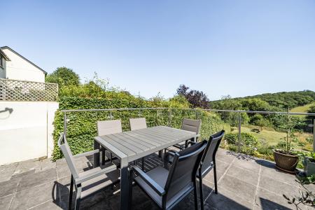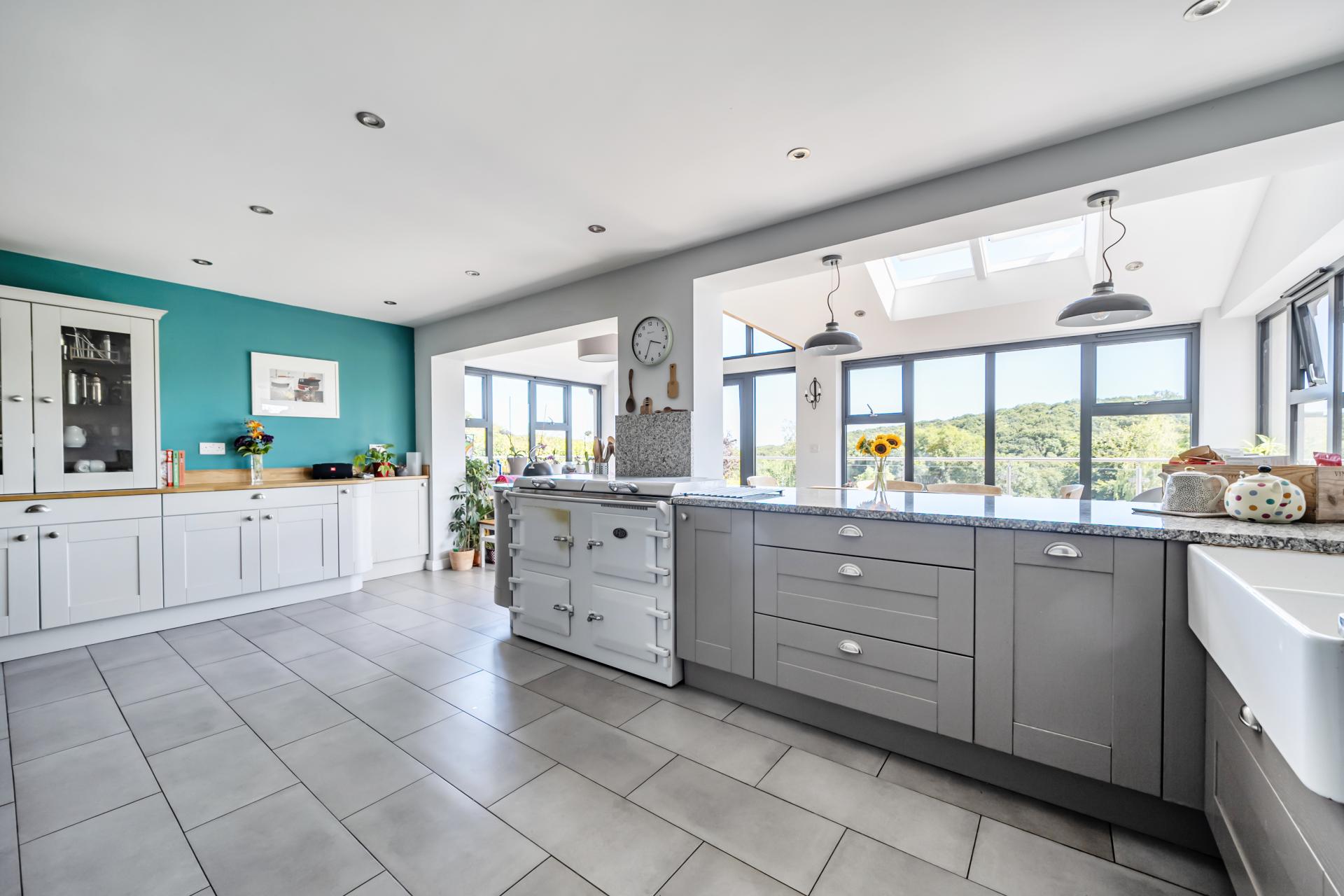 The kitchen is thoughtfully designed with granite worktops, a double sink with mixer taps, breakfast bar, and ample space for a range-style cooker, fridge/freezer, and integrated dishwasher. Additional base units with wooden worktops and a dresser-style unit provide excellent storage. The dining area is bathed in natural light, thanks to triple-aspect grey aluminium windows, Velux rooflights, and French windows opening onto a raised terrace-perfect for entertaining while taking in the panoramic views.
