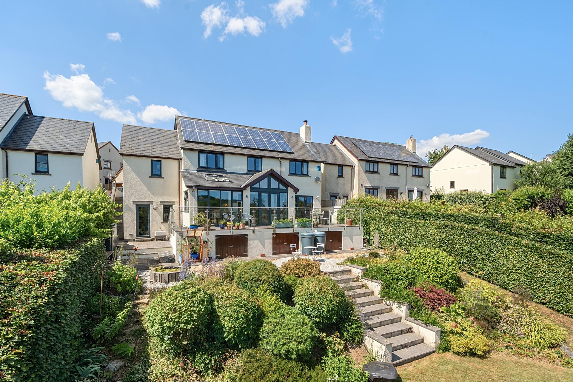 The front garden has been landscaped for low maintenance, with a variety of colourful plants and shrubs. A private drive offers off-road parking in front of the single garage, which includes power, lighting, overhead storage, the solar panel inverter and battery, and room for an electric vehicle charging point.