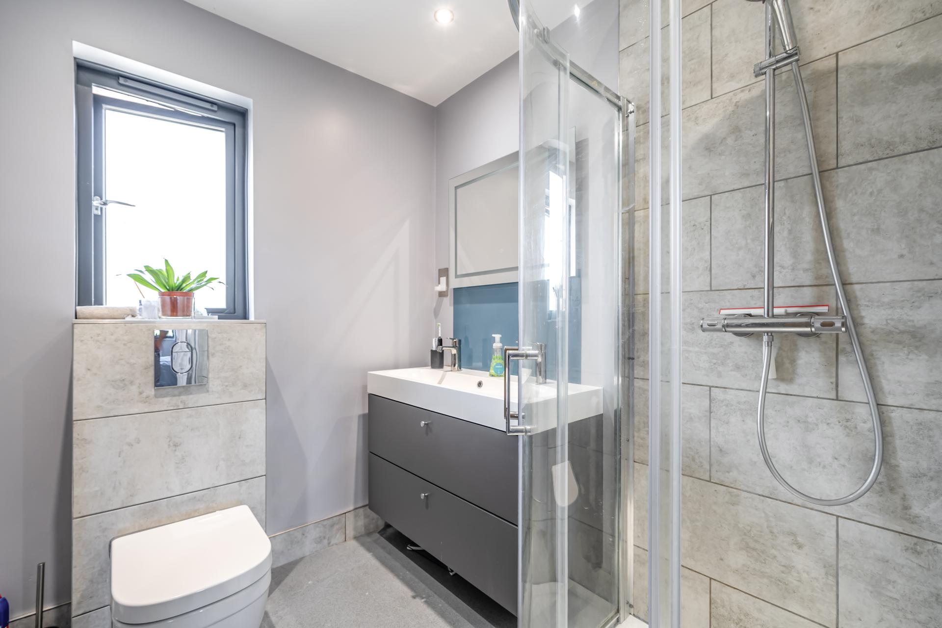 Upstairs, the principal bedroom features a walk-in dressing room with automatic lighting and an en-suite shower room with a hidden-cistern WC, vanity basin, and shower cubicle. Three further bedrooms and a stylish family bathroom, with a bath, walk-in shower, vanity basin, and WC, complete the first floor.