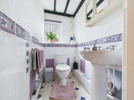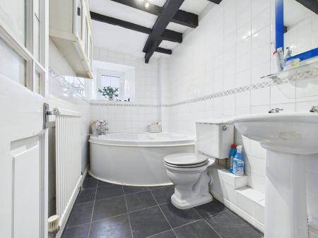 BATHROOM Comprising of white corner bathroom, low level w/c and washbasin, radiator and window to front.