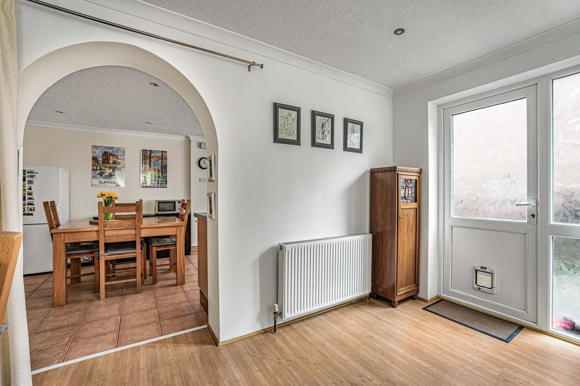 Inside, the welcoming entrance hall leads through to a bright front aspect lounge, a comfortable and inviting space filled with natural light from a large window overlooking the front garden. This well proportioned room provides an ideal setting for relaxing with family or entertaining guests.