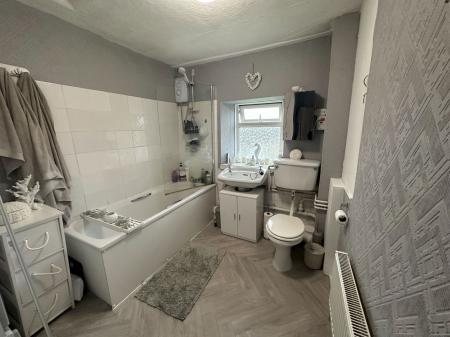 BATHROOM - 2.27m x 3.46m (7'5" x 11'4") A modern bathroom suite comprising bath, overhead shower, low level WC, wash hand basin with vanity surround. Obscure window to back, radiator.