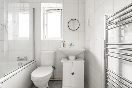 Upstairs you will find 2 Double Bedrooms, the main overlooking the front with additional storage cupboard & the other overlooking the rear Garden. The Bathroom is modern, white, fully tiled, with heated towel rail.