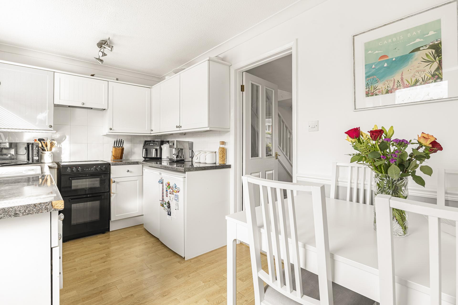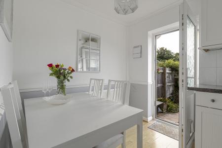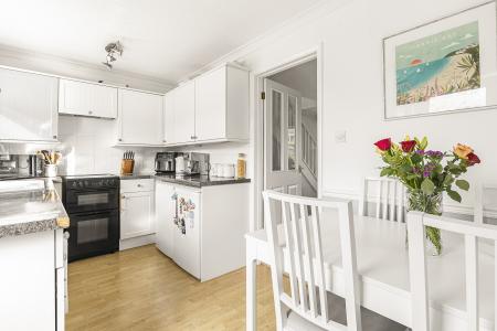The front Garden & pathway lead into the main Living Room that overlooks the front. This Open Plan space with the staircase has plenty of natural light & room for sofas. From here you walk on through into the Kitchen Dining Room that overlooks the Patio & Garden. Ample space for a dining table/breakfast bar, French Doors out to the Garden & a modern Kitchen area, lots of storage, work surfaces, space for under counter fridge/freezer, washing machine & cooker, with sink under the window looking out over the spacious rear Garden, again giving lots of light & a green leafy view, finished with wood laminate flooring.