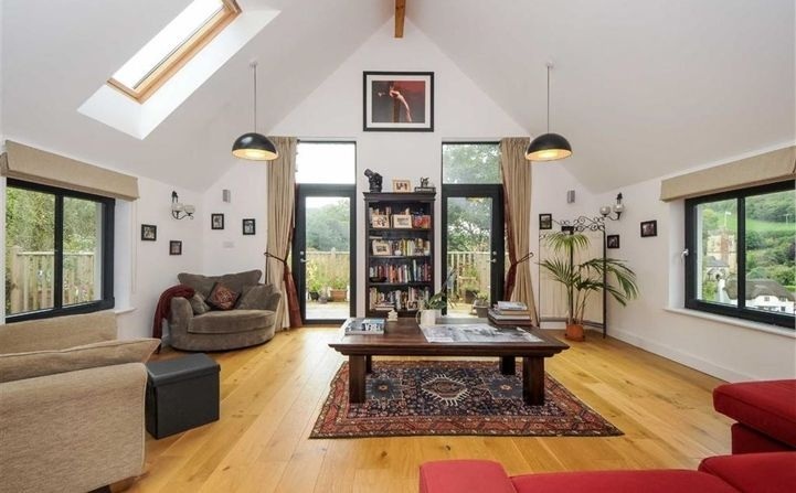 Set within approximately 0.6 acres, the home has been cleverly arranged on a reverse level basis to maximise the far-reaching outlook over the village and countryside beyond. The principal living accommodation is positioned on the first floor, where a striking vaulted ceiling with exposed central beam creates a wonderful sense of space and light. Multiple windows and rooflights flood the interior with natural light, and engineered oak flooring extends throughout this level.