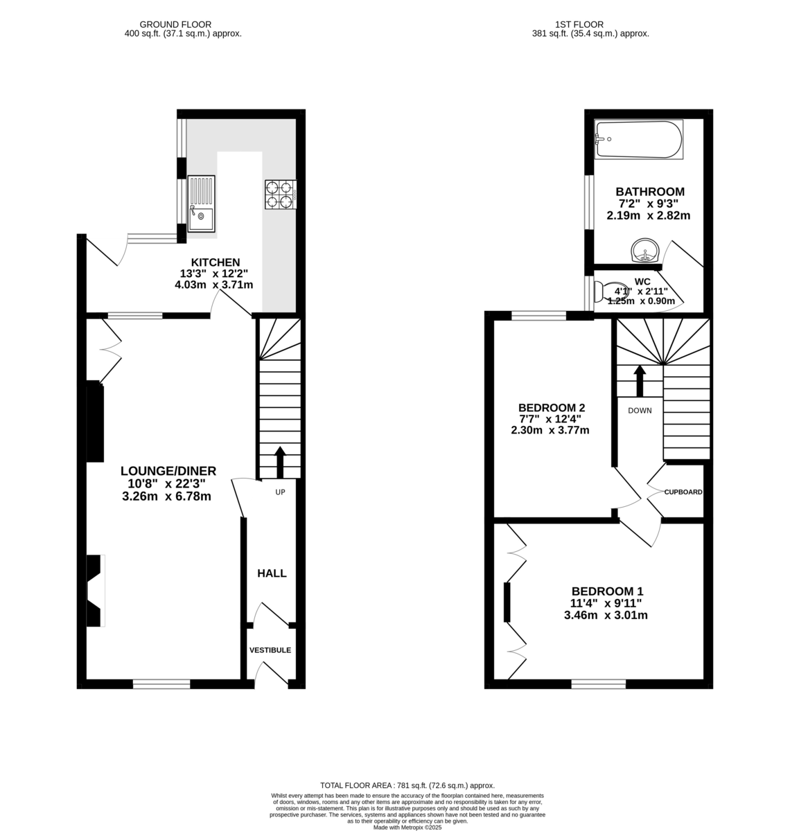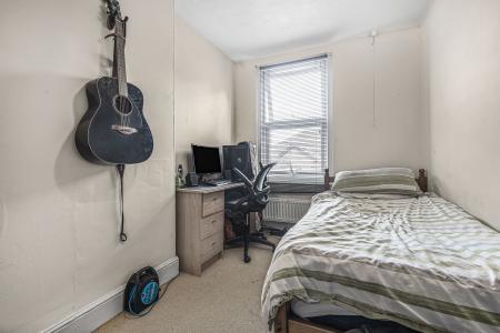 Upstairs, you'll find two bedrooms. The main bedroom is a good-sized double, located at the front of the property, and features a built-in wardrobe unit. The room is neutrally decorated and carpeted. The second bedroom is a smaller double, with a window overlooking the rear garden.
