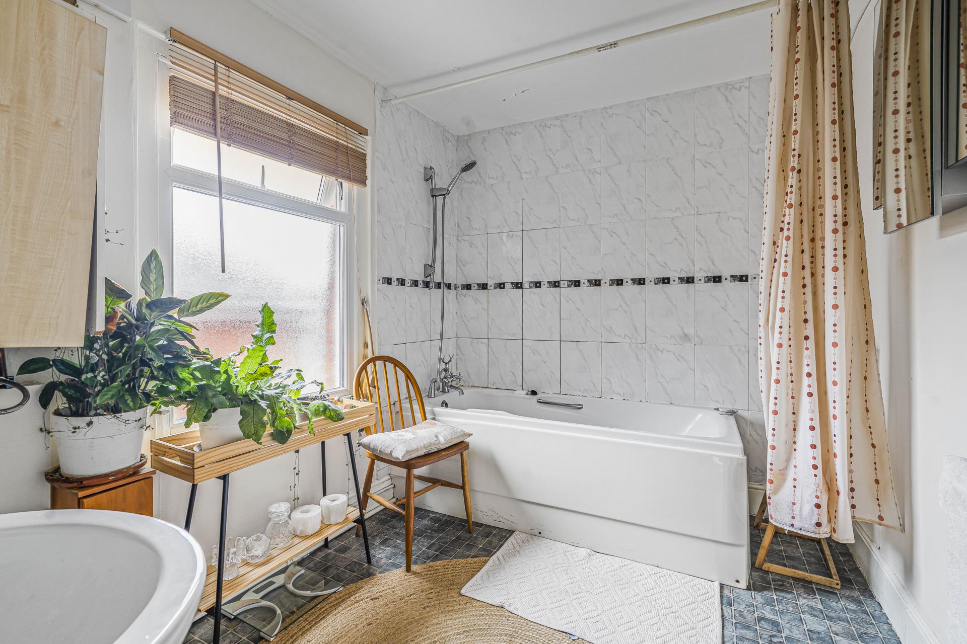 The first floor also accommodates a separate WC, and a spacious family bathroom. The bathroom includes a white bath with a shower over, a tiled splash back, a sink with a mirror above, and a wood-effect cupboard housing the gas boiler for central heating and hot water. Vinyl flooring completes the bathroom.