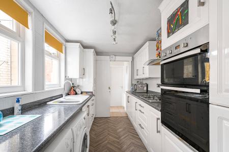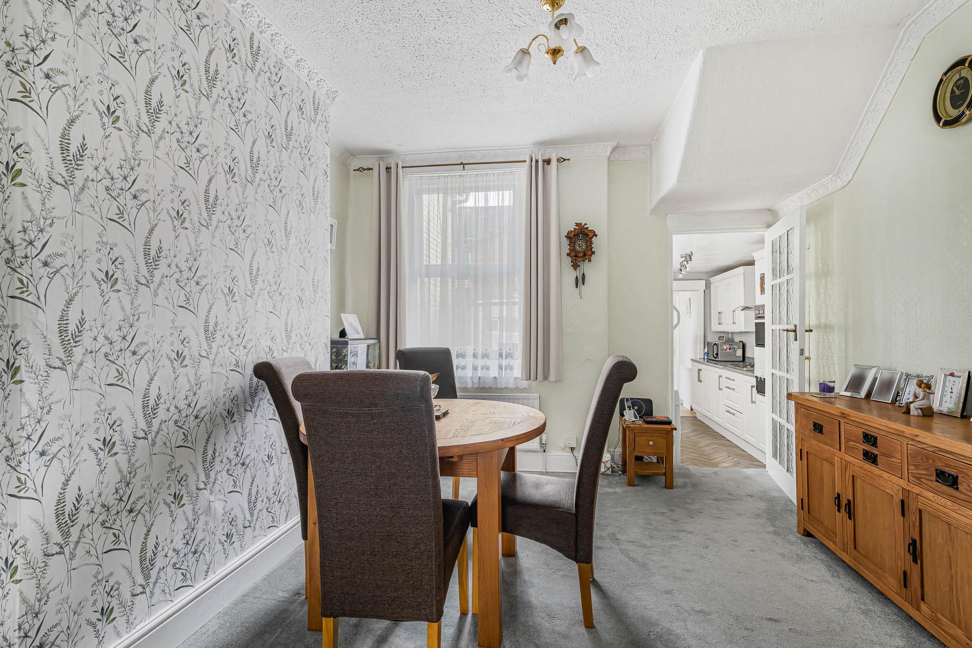 To the rear of the property is a well proportioned dining room with access to the garden, providing an ideal setting for family meals, entertaining guests, or everyday living. The modern kitchen is stylish and thoughtfully designed, featuring contemporary units, generous work surface space, and room for appliances, making it both practical and attractive for day to day use.