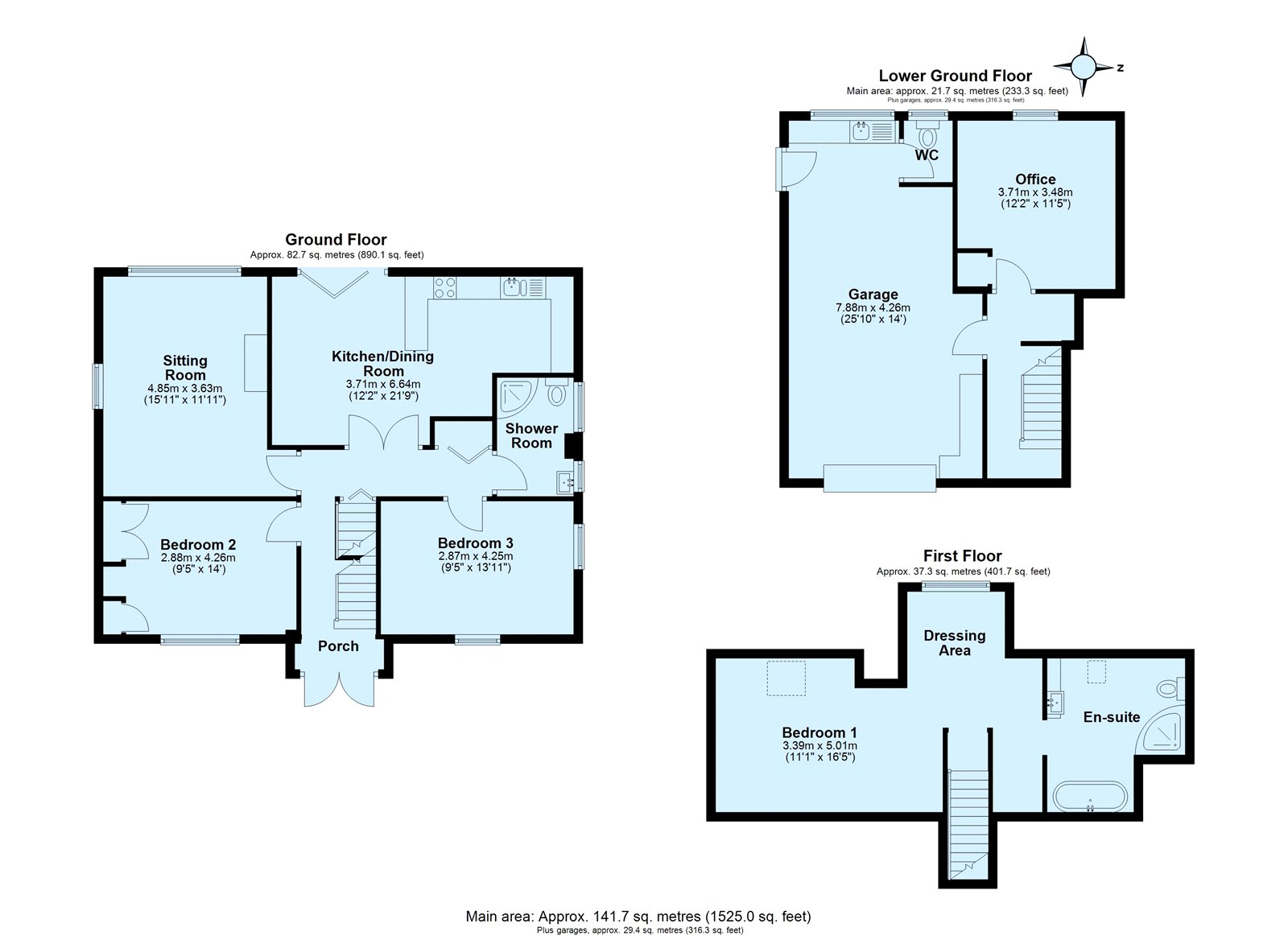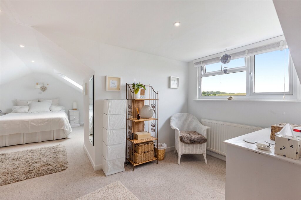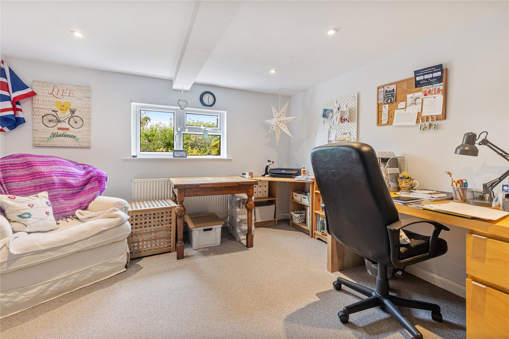 Arranged over three floors the accommodation comprises entrance porch, giving access to the hallway through to two double bedrooms, and a shower room. The sitting room is well-presented with a gas log effect fire, the modern open plan kitchen/dining room is well-equipped with integrated appliances, and the dining space has a Juliet balcony with bi-fold doors to enjoy the countryside views. To the first floor is a lovely bright and airy, substantial master bedroom with dressing area and a large en-suite with shower cubicle and bath. The lower ground floor offers a home office and access to the garage with cloakroom. There is access to storage area with potential for further development.