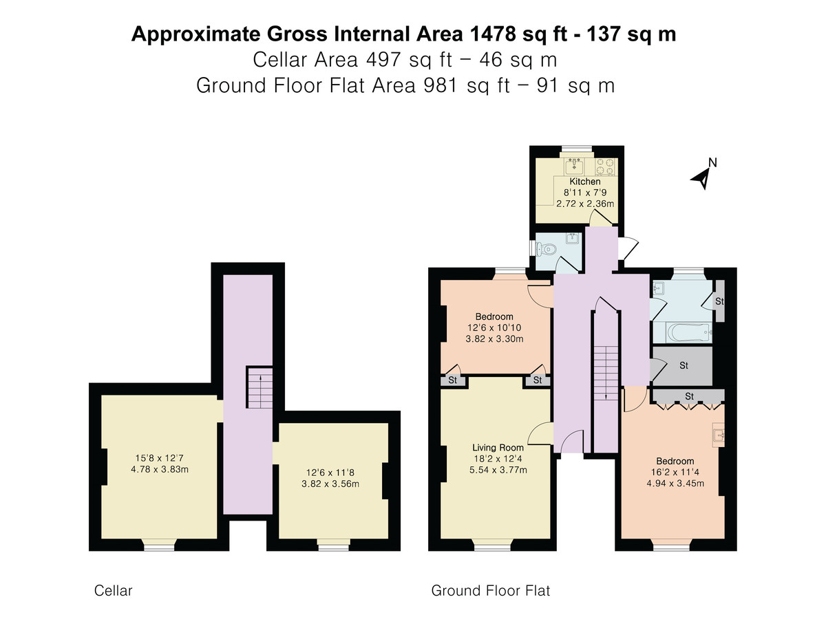 As the property occupies the whole Ground floor, behind the Living Room, is the 2nd Double Bedroom, overlooking the Garden area. A modern Kitchen also has the main view of the private Garden along with a white Bathroom. A side door from the inner hallway leads out to the rear, walled & private Garden, a valuable extra space within the townscape of these types of properties. The basement cellar is also accessed via the inner hallway, by the Kitchen.