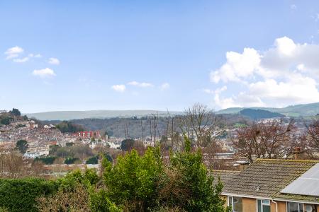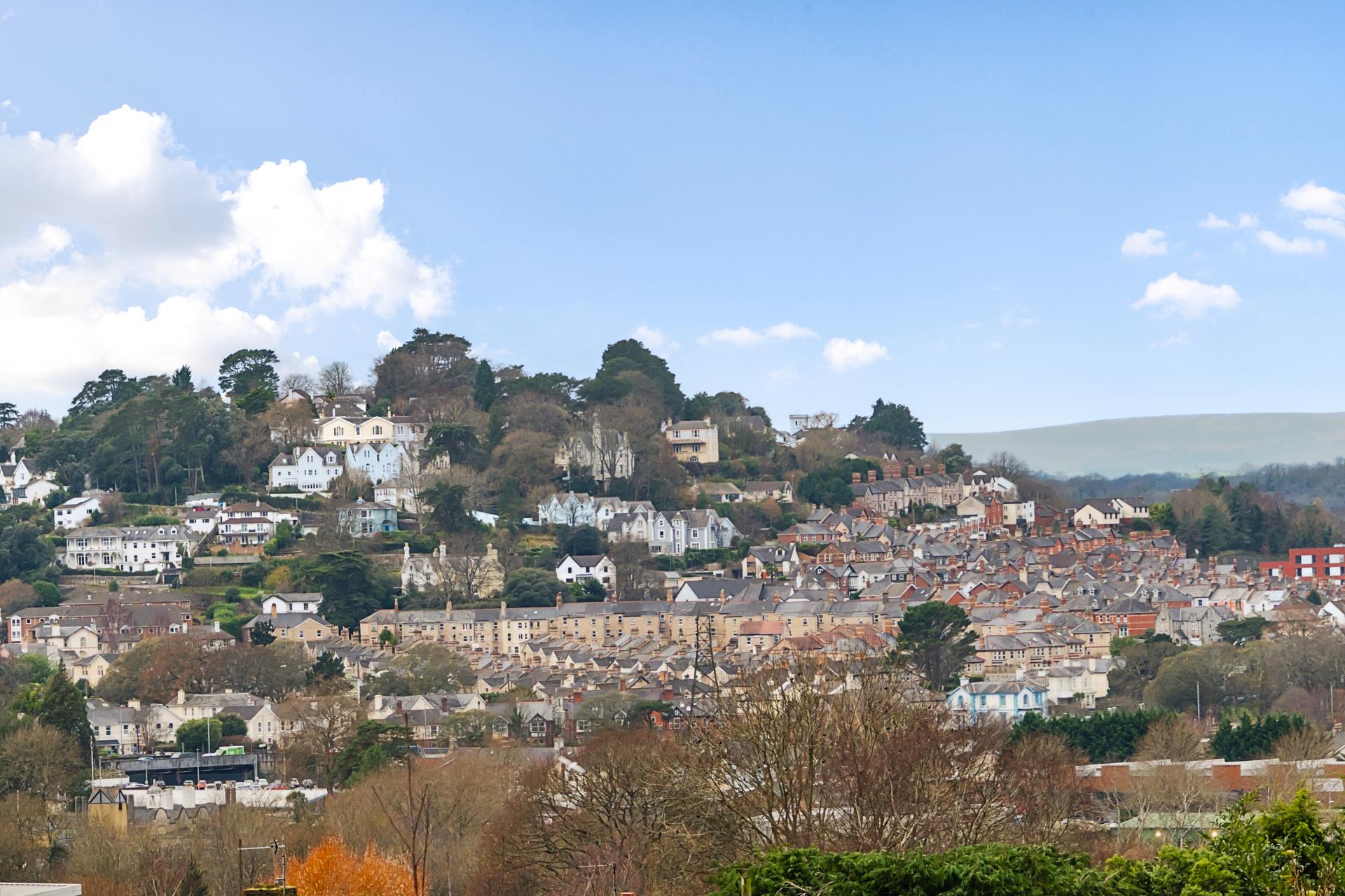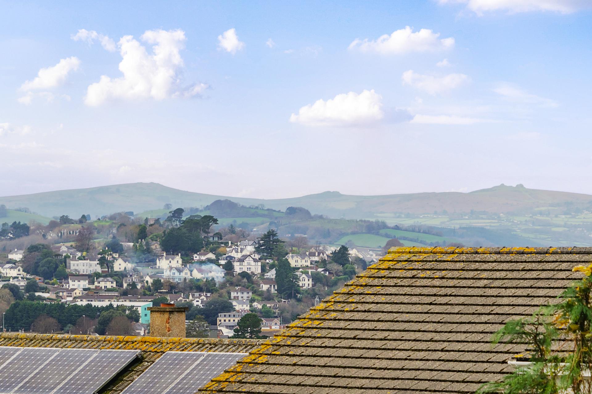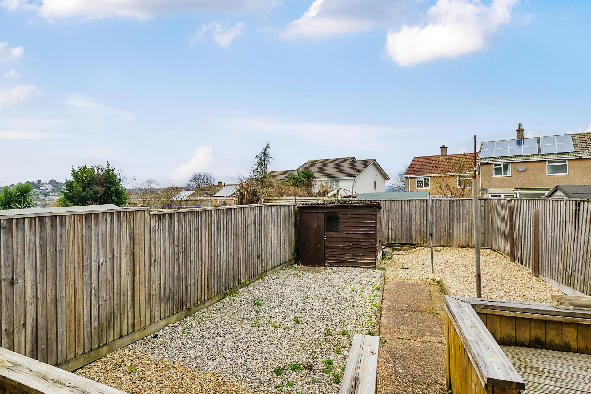 The low-maintenance rear garden features a raised deck area from the conservatory, with a couple of steps leading down to a path dividing two graveled sections. At the bottom of the garden, you'll find a shed for essential storage. A particular highlight is the stunning view over Newton Abbot and Dartmoor.