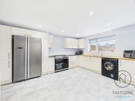 - Modern open-plan kitchen and dining area with ample wall and base units