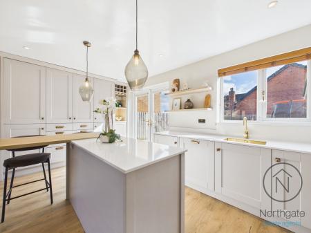 - Modern open-plan kitchen/breakfast room with shaker-style units, central island and French doors to the garden.