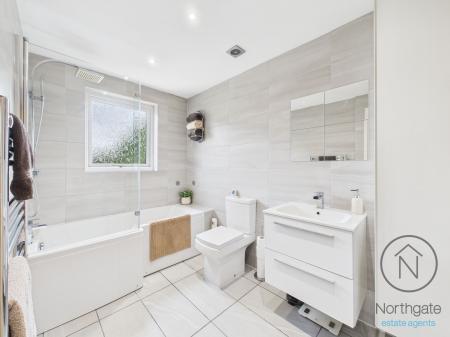 Upstairs, the property offers three well-proportioned bedrooms, each designed to provide a quiet retreat. The master bedroom is particularly impressive, with generous space and plenty of natural light. A beautifully finished modern bathroom complements the first floor, featuring stylish fixtures and a clean, contemporary look.