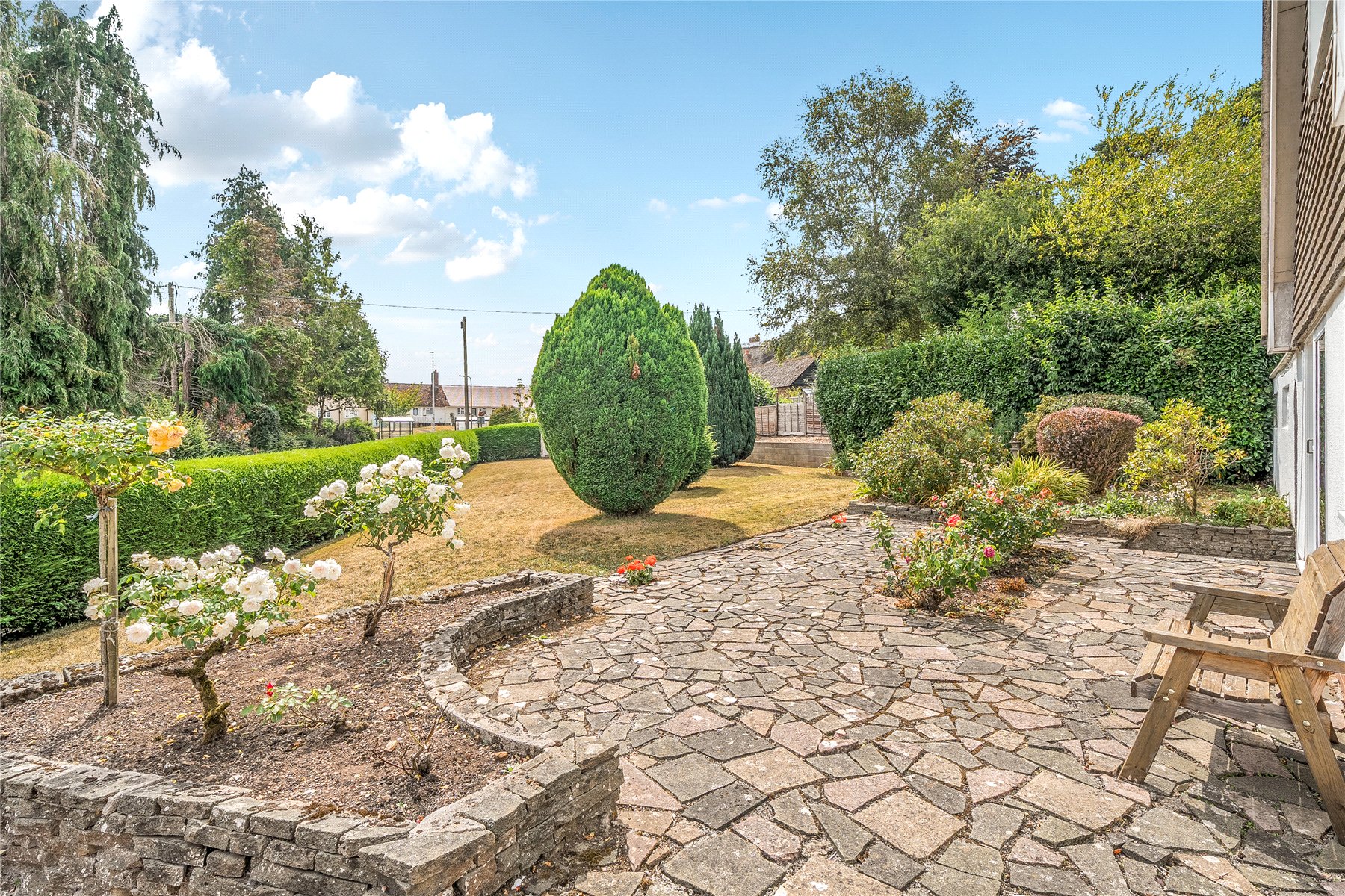 Outside, a private driveway provides off-road parking in front of a double-length garage with an electric up-and-over door, power, light, and a side door to the gardens. There is also an EV charging point. A notable feature of the property is its corner plot gardens, extending to approximately 0.3 acres. They are mainly laid to lawn, with a generous frontage and delightful rear gardens containing apple and pear trees, two summer houses, and patio areas - one adjoining the swimming pool.