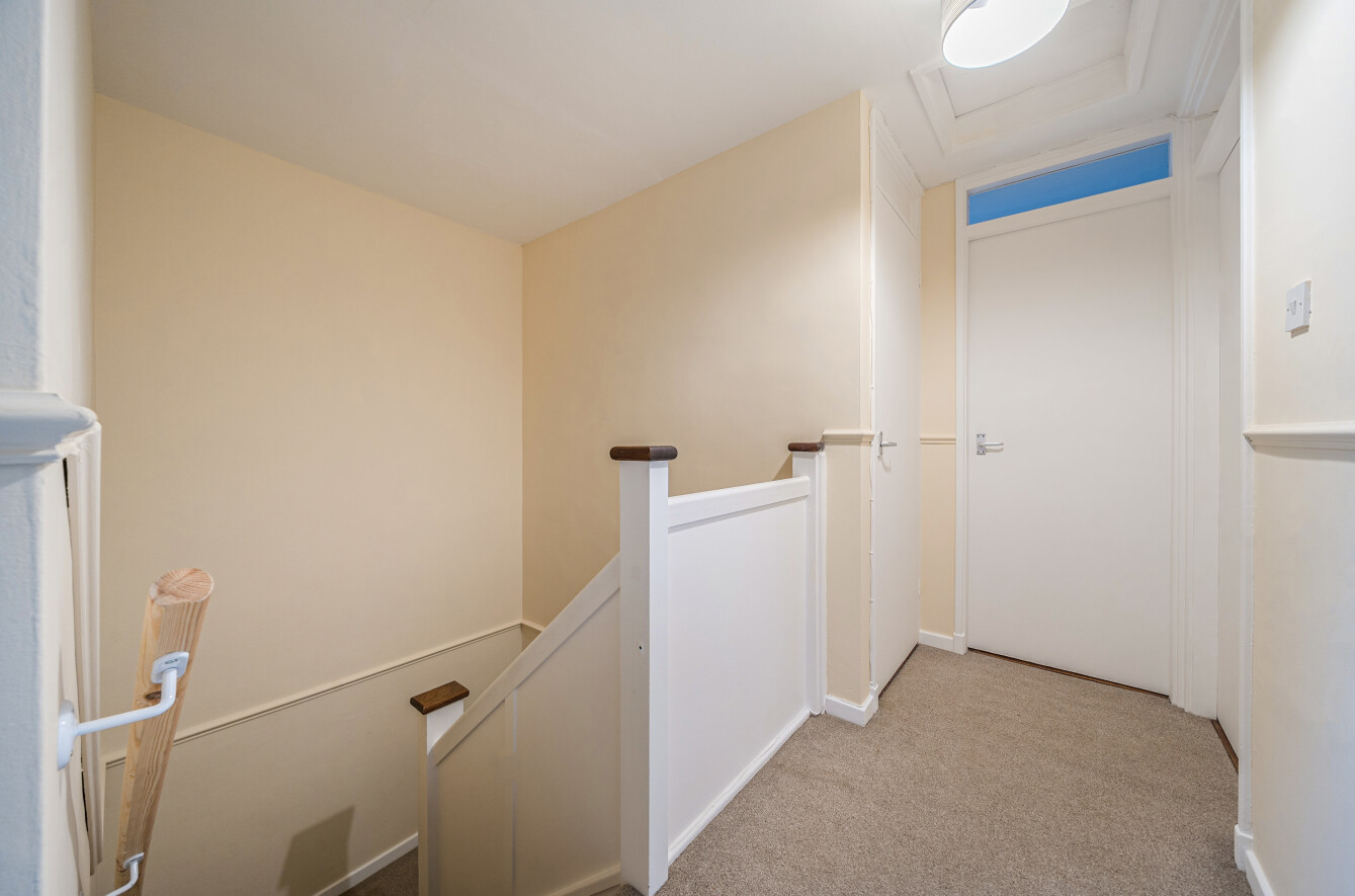 Landing with walk-in store cupboard and airing cupboard with gas central heating boiler.