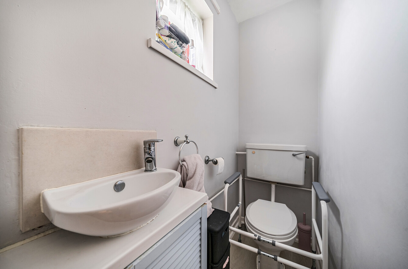 Cloakroom with WC and washbasin with cupboard under.