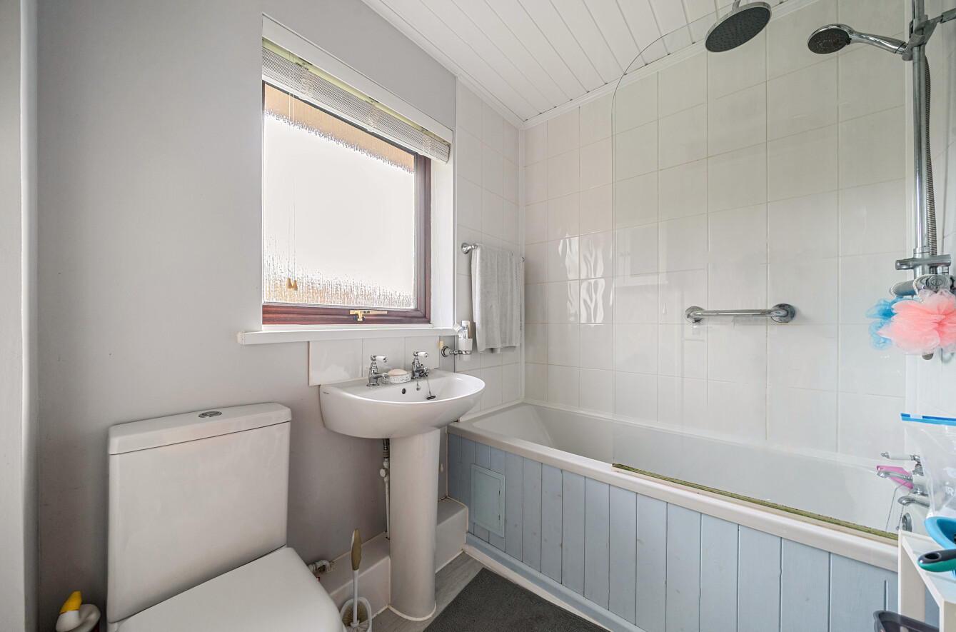 Bathroom with white suite comprising panelled bath with mixer shower over, WC, washbasin.