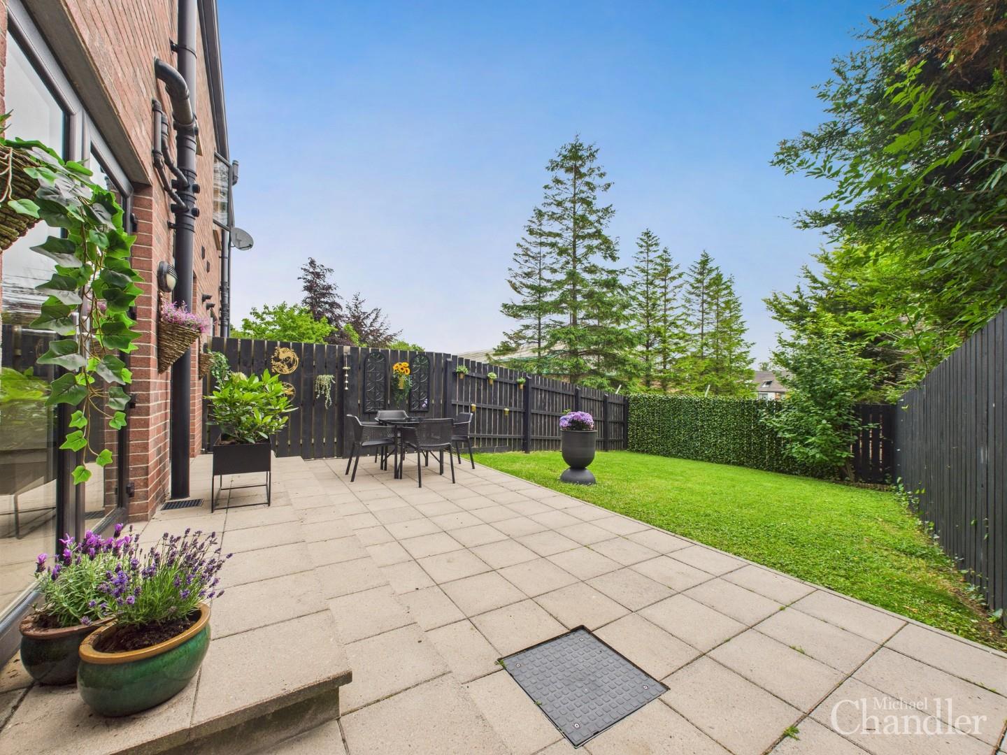 Private fully enclosed rear garden with garden laid in lawn and spacious patio area