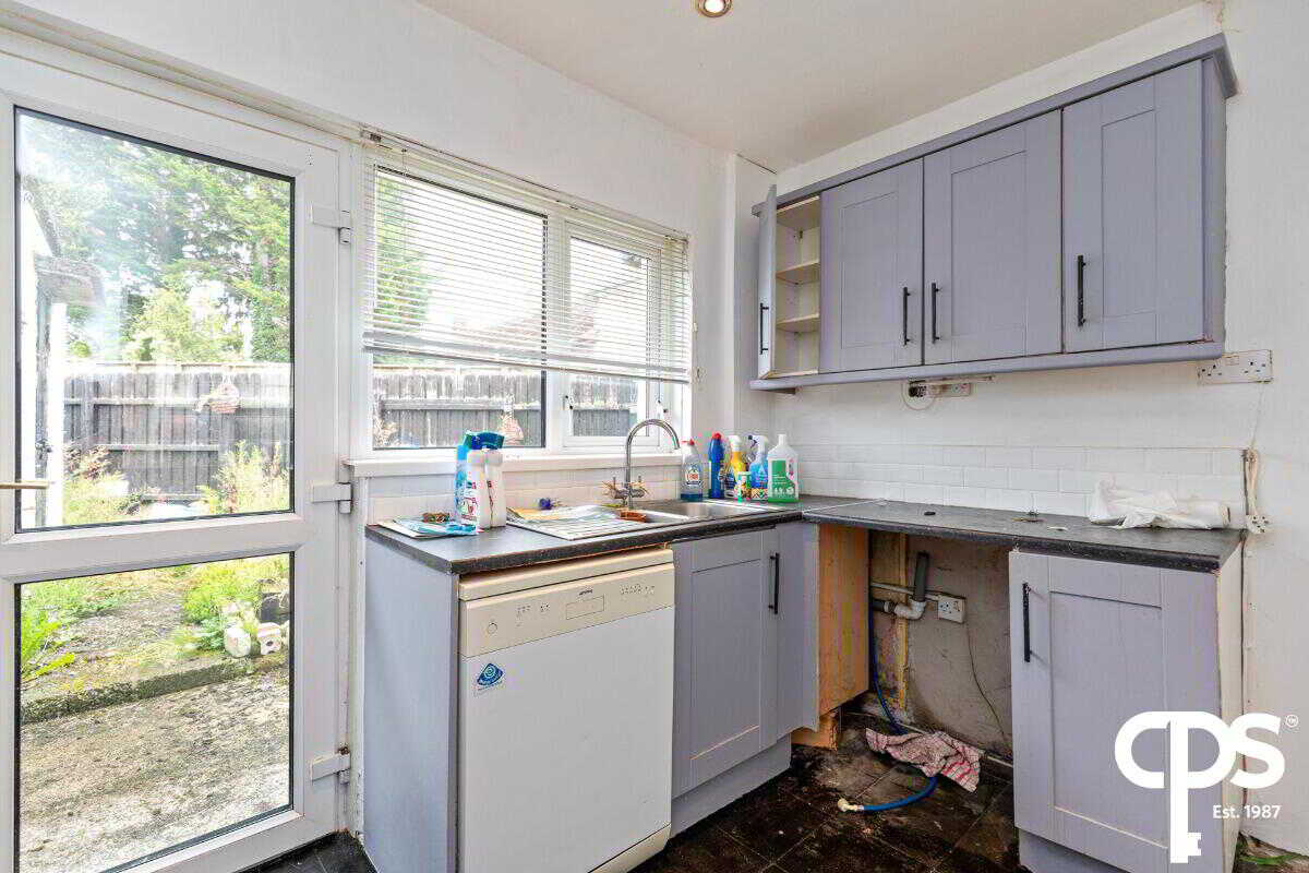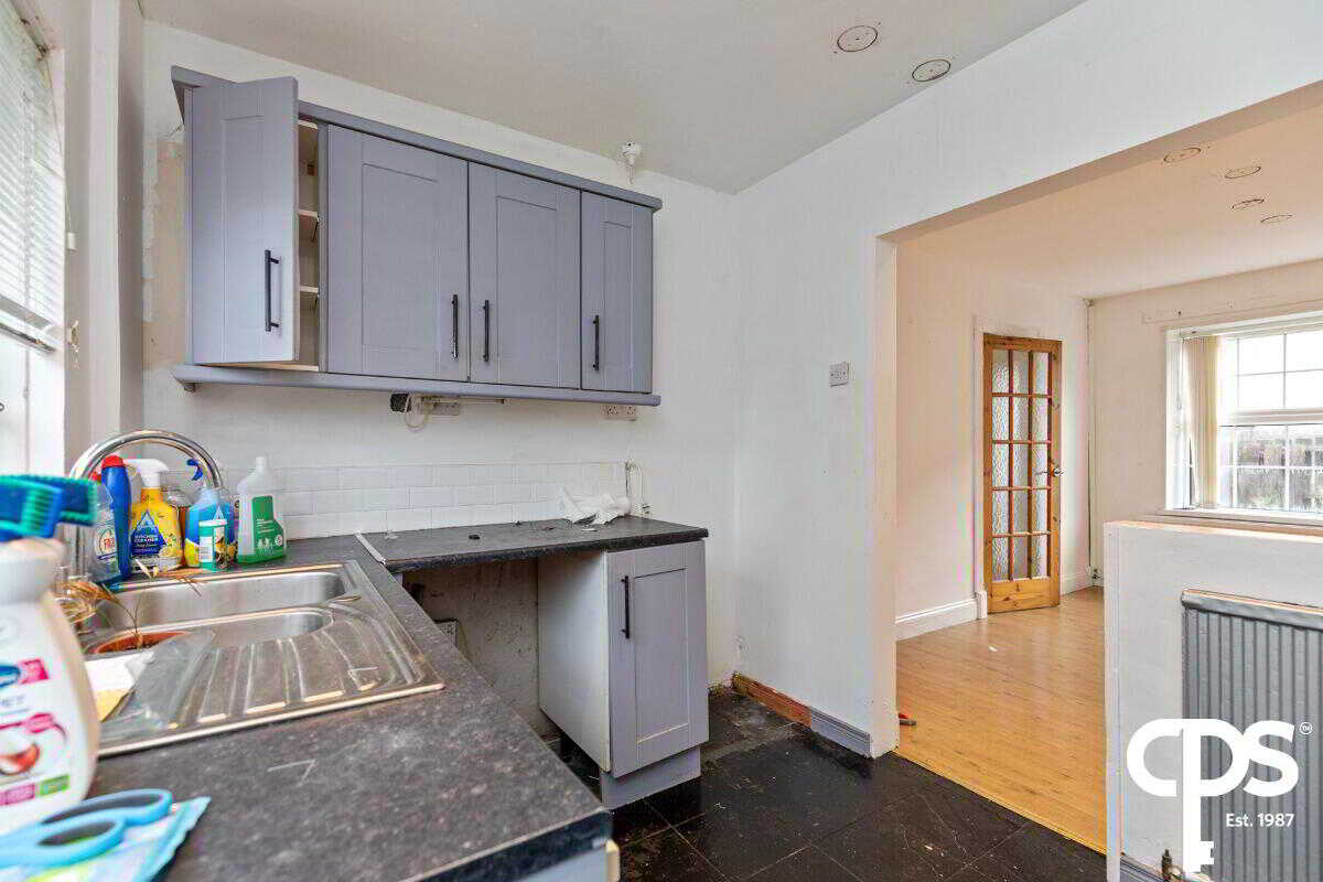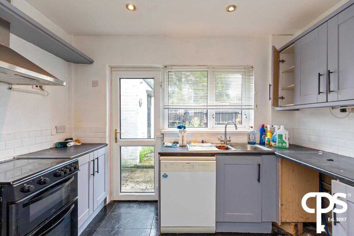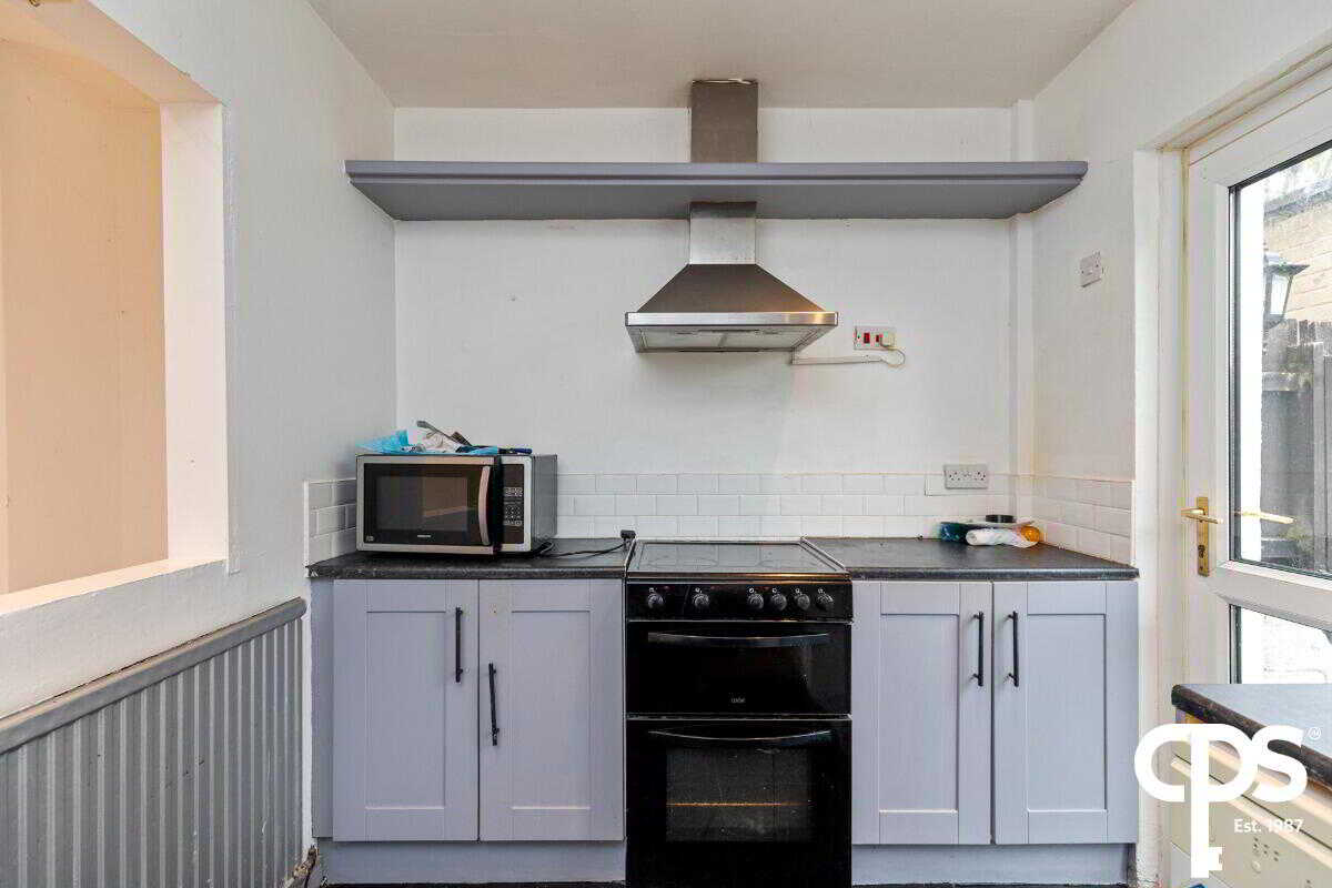 Tiled floor. Range of high / low level cupboards. Freestanding electric oven and hob. Overhead Stainless-steel extractor fan. Stainless steel drainer sink unit. Plumbed for dishwasher. Space for Fridge freezer. Glazed door to rear yard.