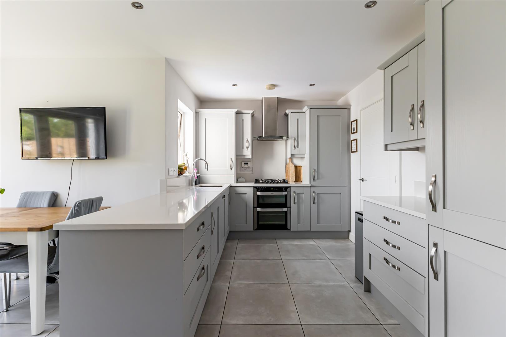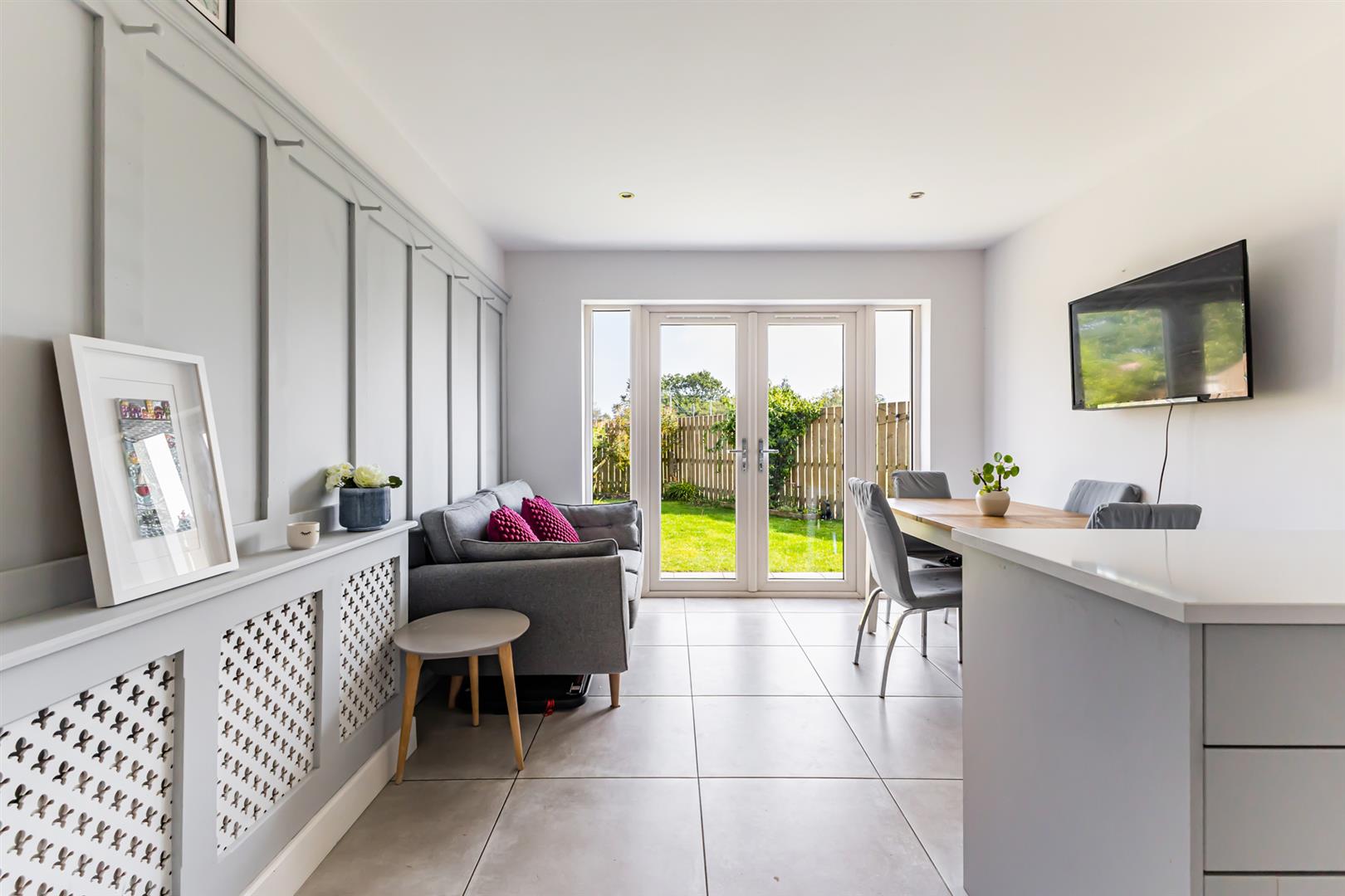 Kitchen/Living/Dining - 5.08m x 5.03m (16'8" x 16'6") - Porcelain tiled floor, part panelled walls, recessed spot lighting, range of low and high level units with solid wood doors, Quartz worksurface and uprights, integrated fridge / freezer, pantry style cupboards, integrated dishwasher, inset stainless steel Franke sink with chrome mixer tap, Belling electric ovens / grill, extractor fan, four ring gas hob, concealed Vaillant gas boiler, access to utility room, ample dining space, living space with outlook over the rear garden.