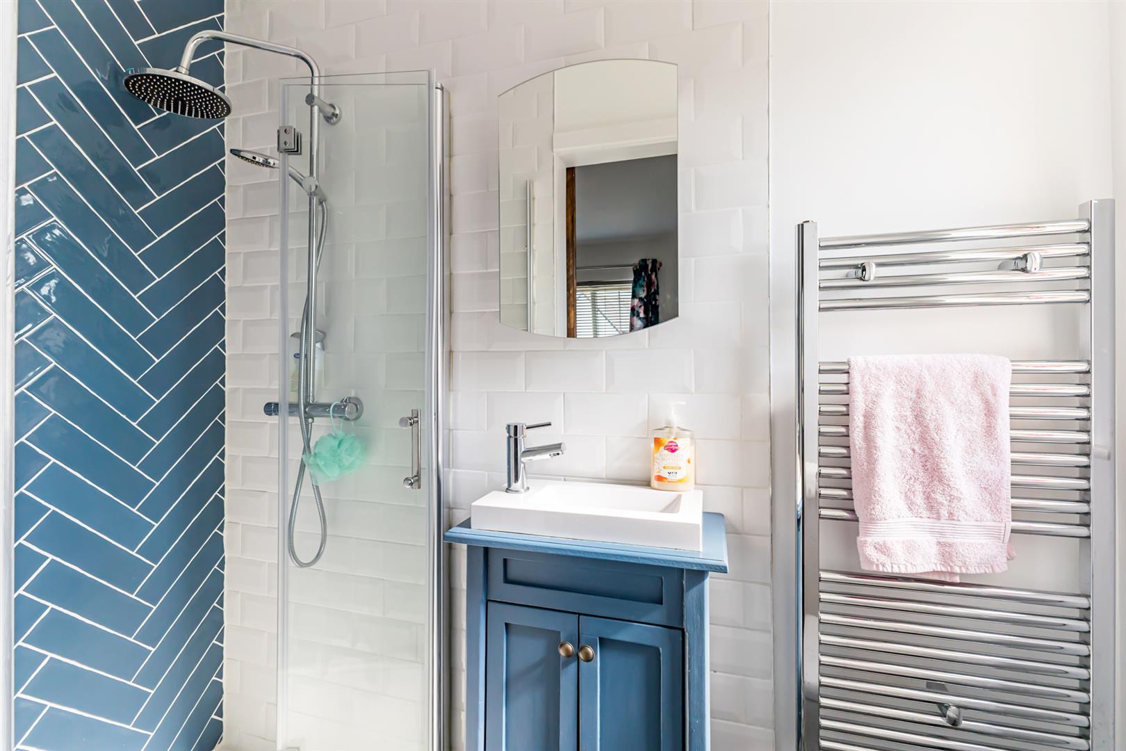 En-Suite Shower Room - 0.89m x 2.21m (2'11" x 7'3") - Decorative tiled floor, part tiled walls, chrome heated towel rail, extractor fan, outlook to side, three-piece modern white suite comprising; low flush WC, vanity unit with sink and chrome mixer tap, shower enclosure with glass door, thermostatically controlled handheld shower and overhead drencher.