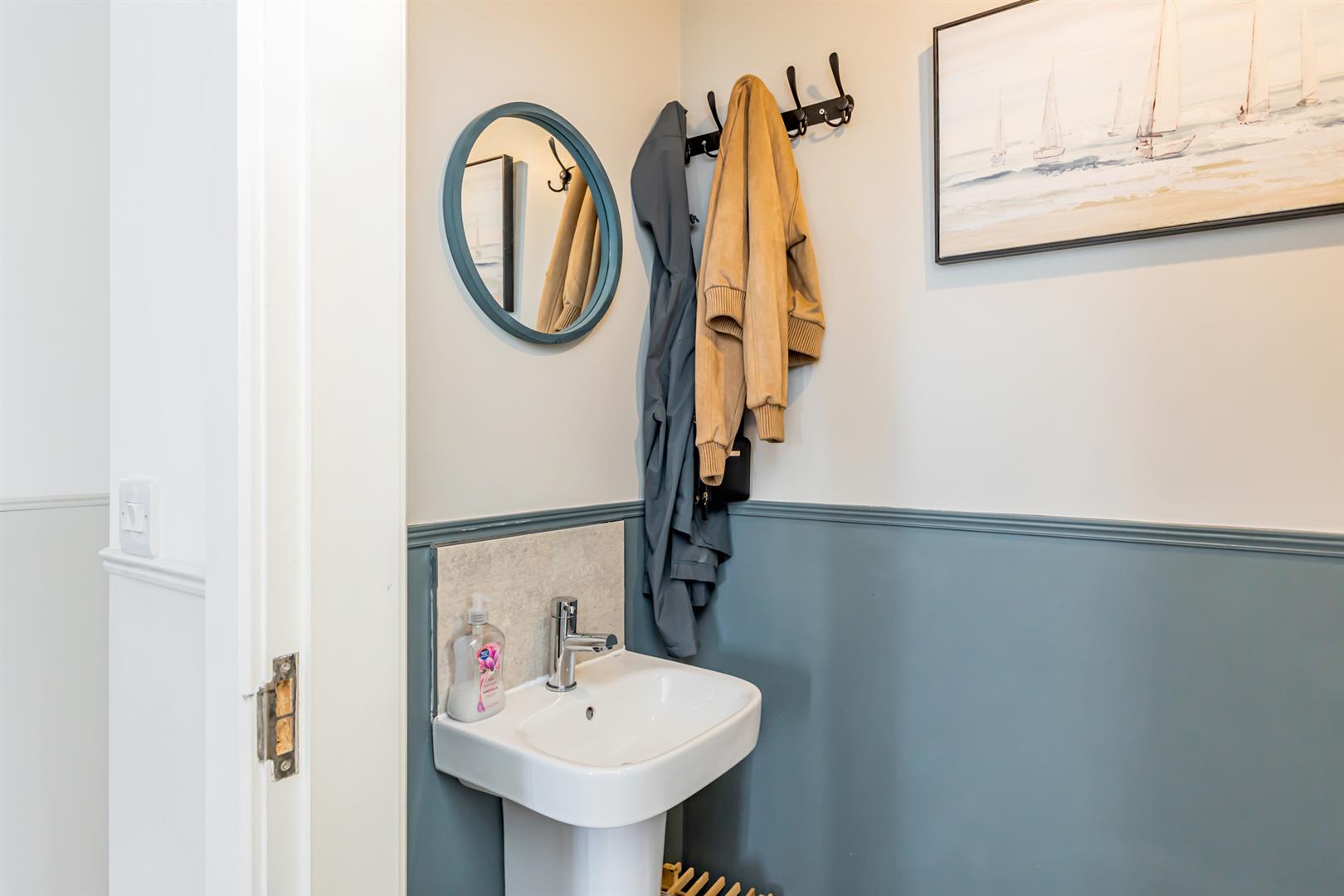 Downstairs Wc - Porcelain tiled floor, ? pedestal sink with chrome mixer tap, tiled splashback, low flush WC, extractor fan