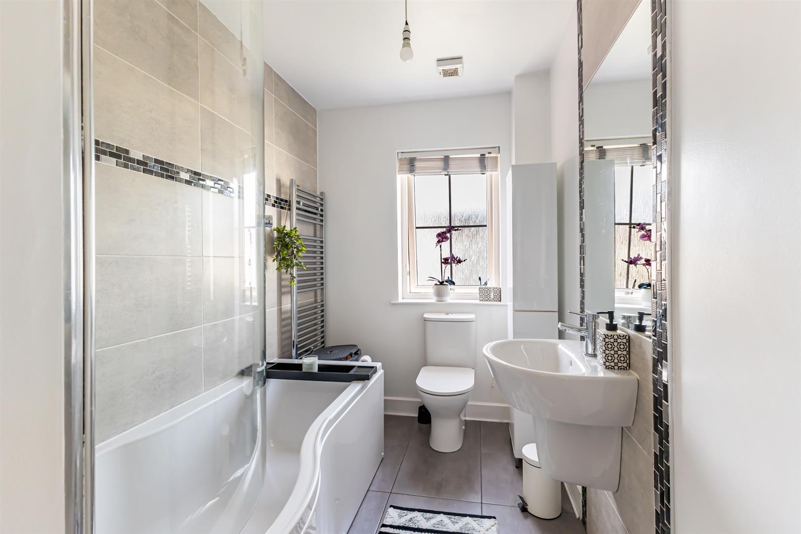 Family Bathroom - 3.05m x 1.75m (10' x 5'9") - Porcelain tiled floor, part tiled walls, outlook to front, chrome heated towel rail, extractor fan, three-piece modern white suite comprising; low flush WC, pea shaped bath with glass shower screen, chrome mixer tap and thermostatically controlled shower, ? pedestal sink with chrome mixer tap.