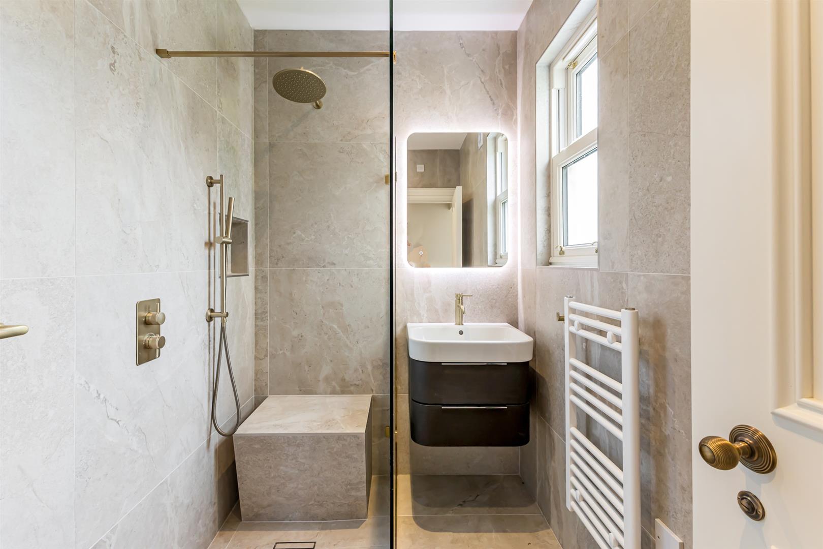 Ensuite Shower Room - 1.52m x 2.26m (5'16 x 7'5) - White suite comprising low flush WC, feature floating vanity unit, brass mixer taps, drawer units below, built-in fully tiled shower cubicle with thermostatically controlled shower unit, porcelain tiled floor and porcelain tiled walls and built-in shower bench.