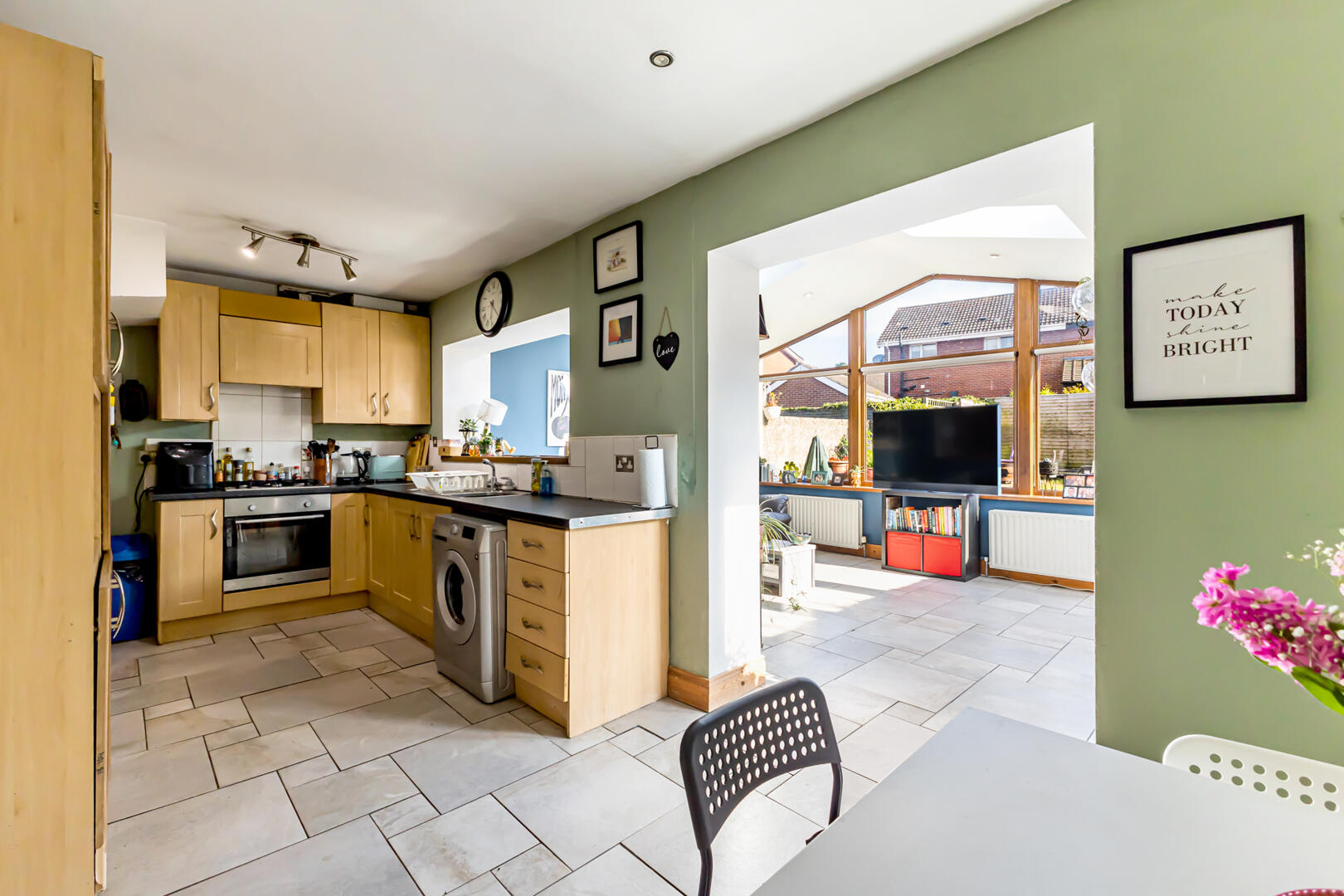 Kitchen/Dining - 9'10" x 19'2" - Ceramic tiled floor, access to under stair storage, range of low and high level units with laminate work surface, tiled splashback, integrated four ring gas hob, extractor fan, Logik integrated electric oven / grill, single stainless steel sink and drainer with chrome mixer tap, space for washing machine, integrated fridge / freezer, recessed spot lighting, ample dining space, open aspect to sunroom