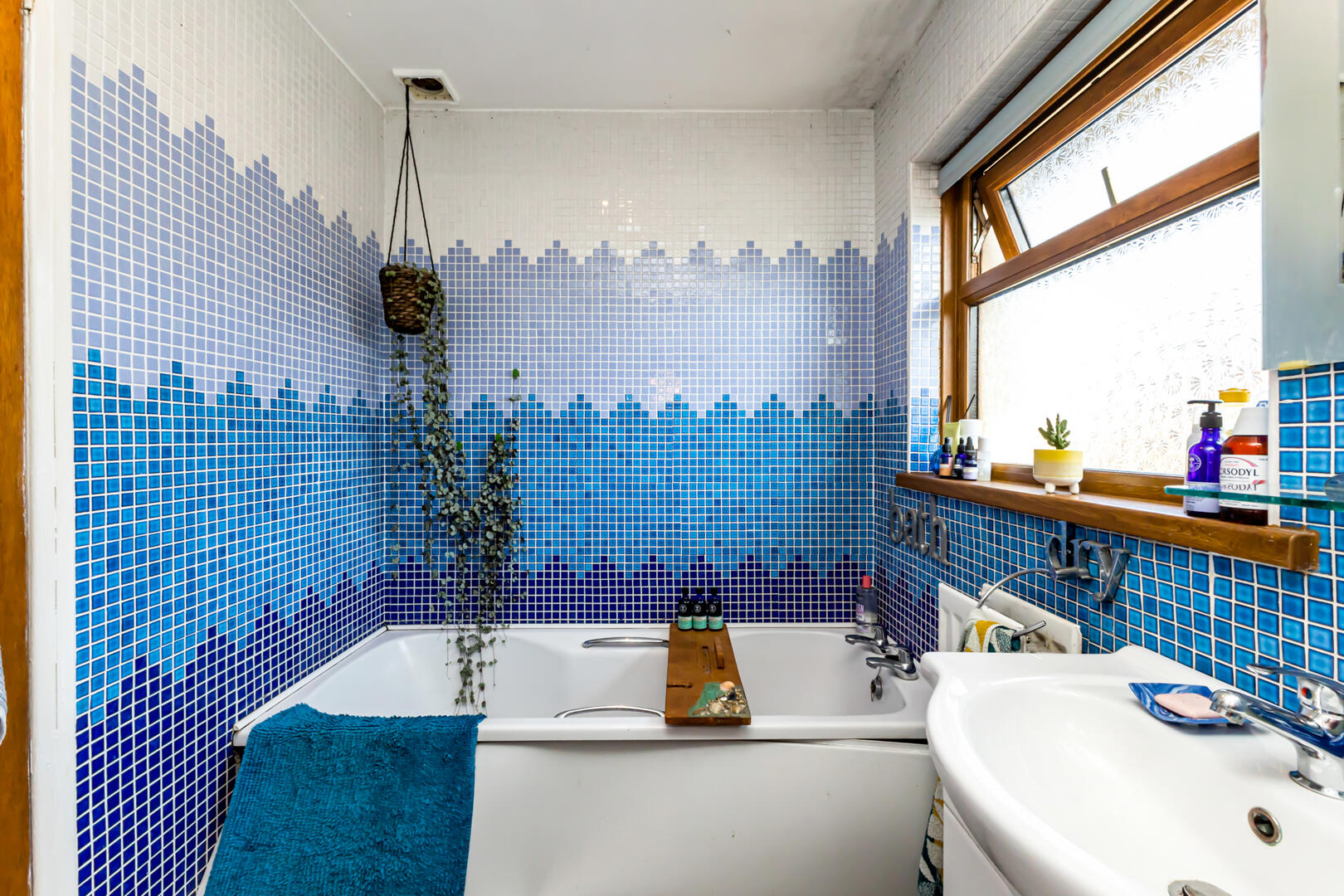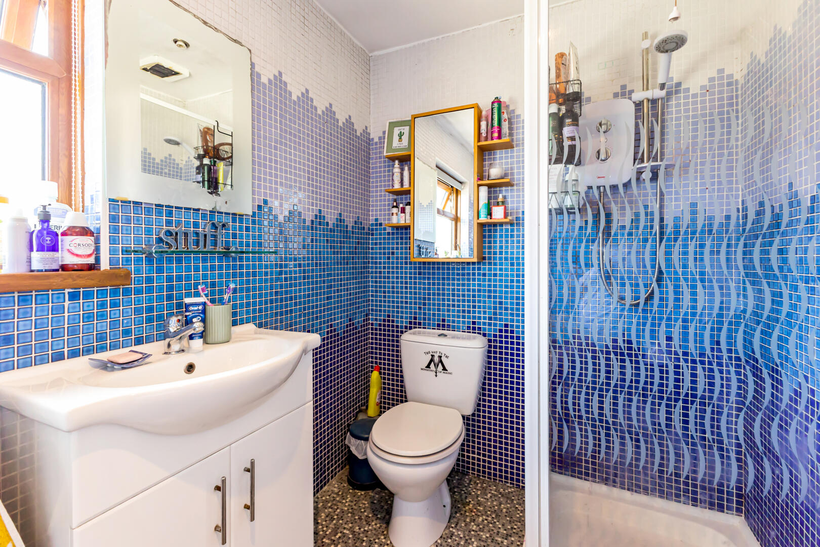 Bathroom - 5'6" x 8'6" - Fully tiled walls, outlook to rear, recessed spot lighting, bath with chrome taps, low flush WC, vanity unit with chrome mixer tap, shower enclosure with Redring Glow electric shower