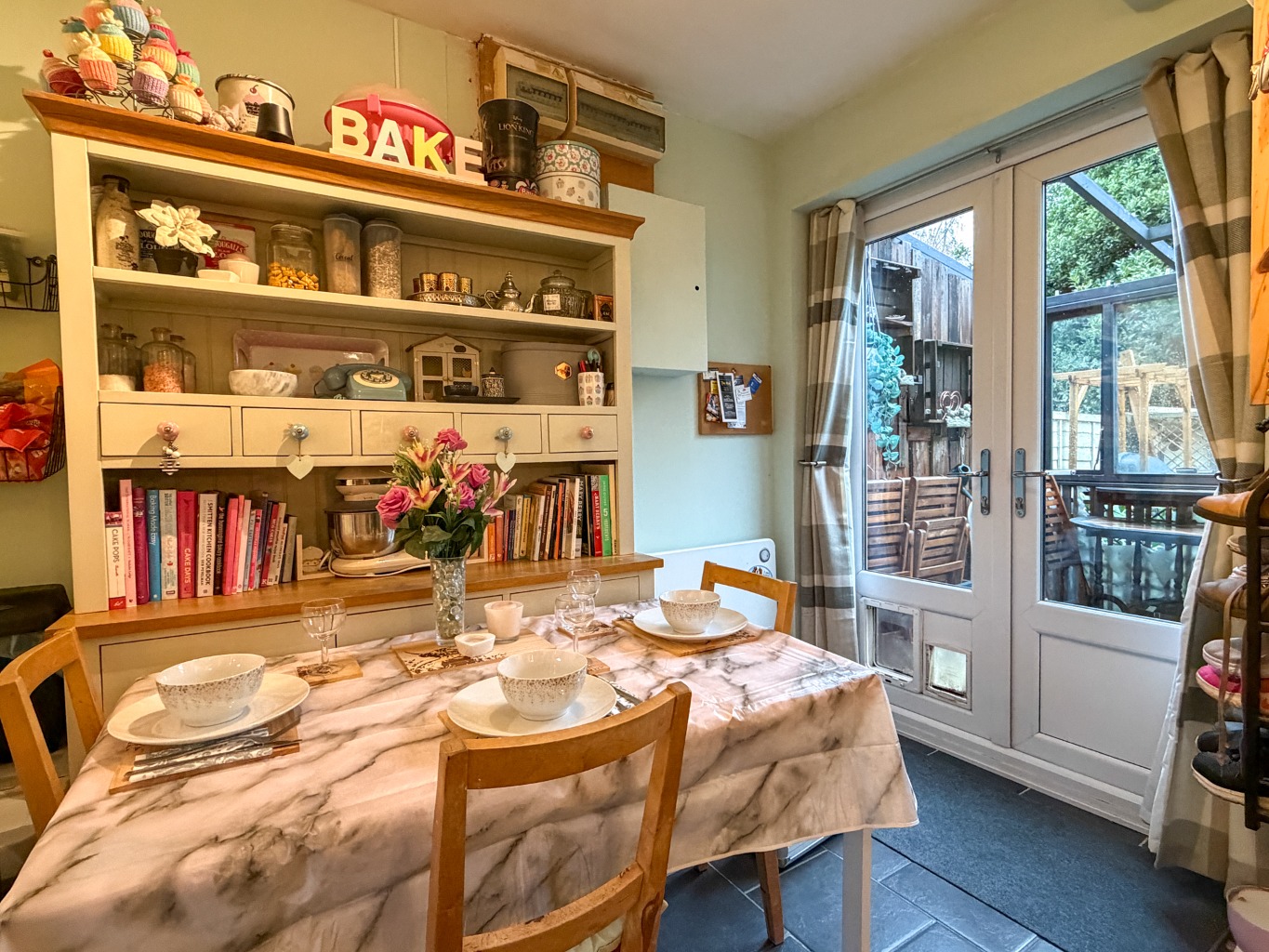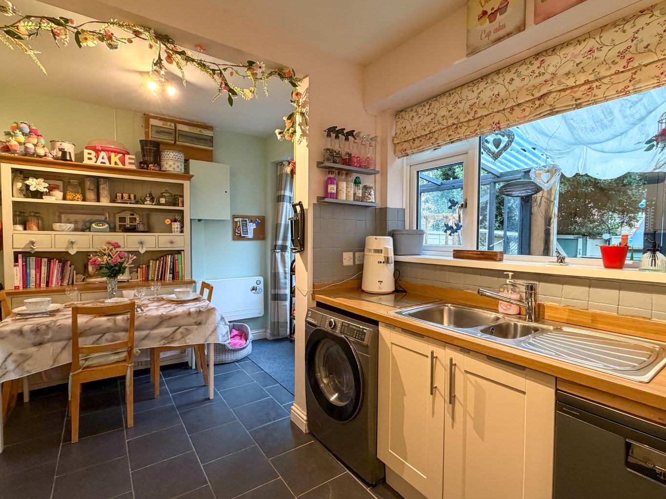 - Fitted Kitchen/Diner with Built-in Ceramic Hob, Electric Double Oven Beneath and Extractor Hood Above, Twin Double Glazed Opening Doors to Garden Room
