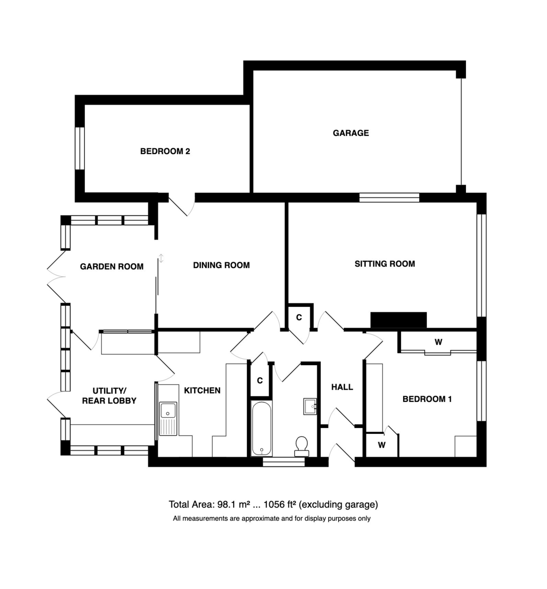 There is a good size sitting room with large picture window overlooking the front garden, separate dining room and well fitted kitchen plus a garden room and rear lobby/utility extension across the back of the bungalow. There are two double bedrooms the principal of which is well fitted with bedroom furniture and the second bedroom off the dining room was converted from the original garage.