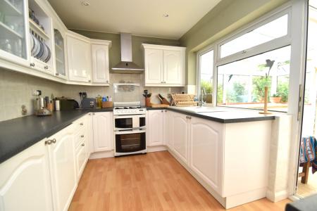 Kitchen 11' 10" x 8' 5" (3.61m x 2.57m) (Rear Aspect) Attractively fitted and comprising Inset 1.5 bowl porcelain sink with mixer tap and cupboards under, further base cupboard and drawer units with work surfaces over, integrated fridge, space for gas cooker, part tiled walls, extractor hood, matching wall cupboards to include glass mounted display, cupboards, plate rack, and corner shelving, radiator, part-tiled walls, wood effect, laminated flooring, ceiling coving, and inset ceiling downlights, part glazed door to: