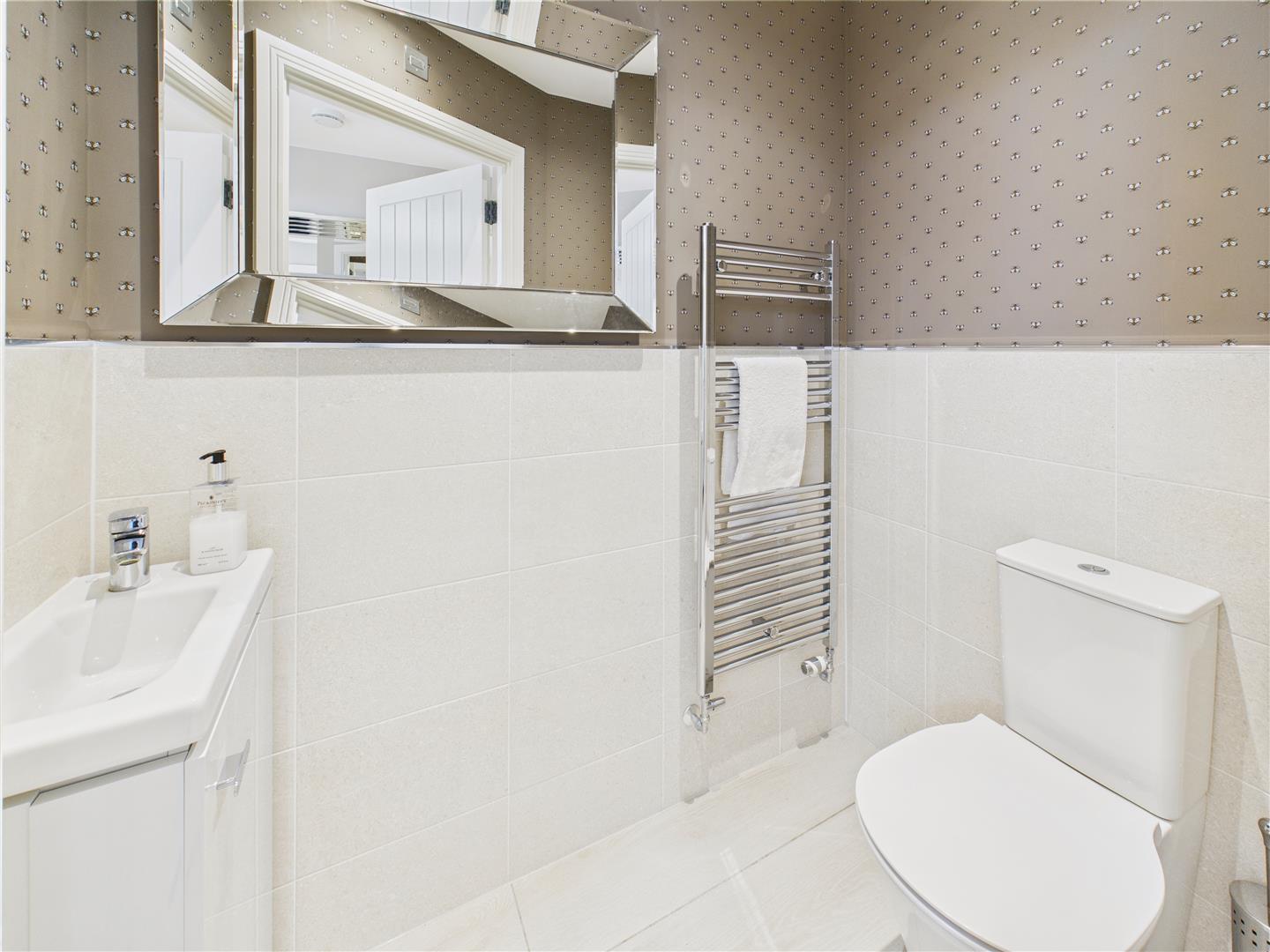 Cloaks/W.C. - With low flush W.C. and vanity unit with wash hand basin. Heated towel rail and tiled floor.