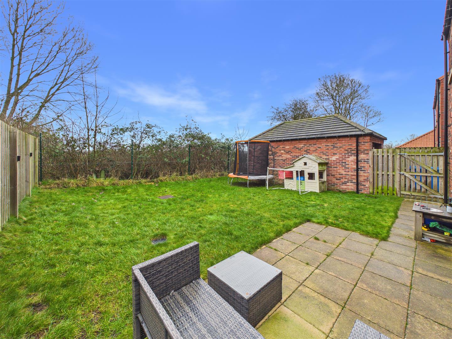 Outside - Outside, the property presents a paved rear patio to the immediate rear of the property followed by a garden which backs on to the community sports fields. The drive to the side of the property leads to a carport, providing convenient access into the utility or the detached garage further down. A path leads to the door at the front with laurel shrubbery offering screening to the front of the house.