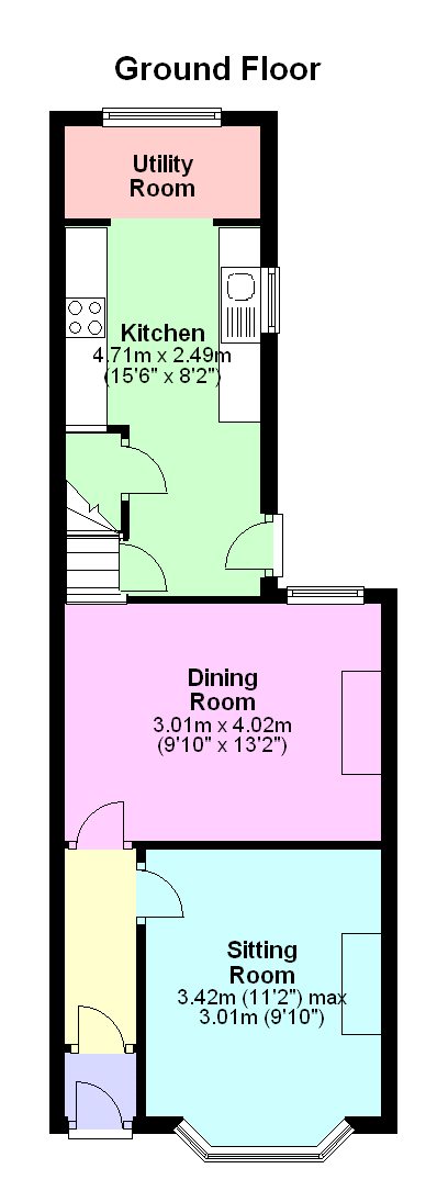 The ground floor comprises a porch leading into the main hallway, with access to a living room, separate dining room, and kitchen to the rear. The layout provides defined living and dining spaces with a practical flow through the property.