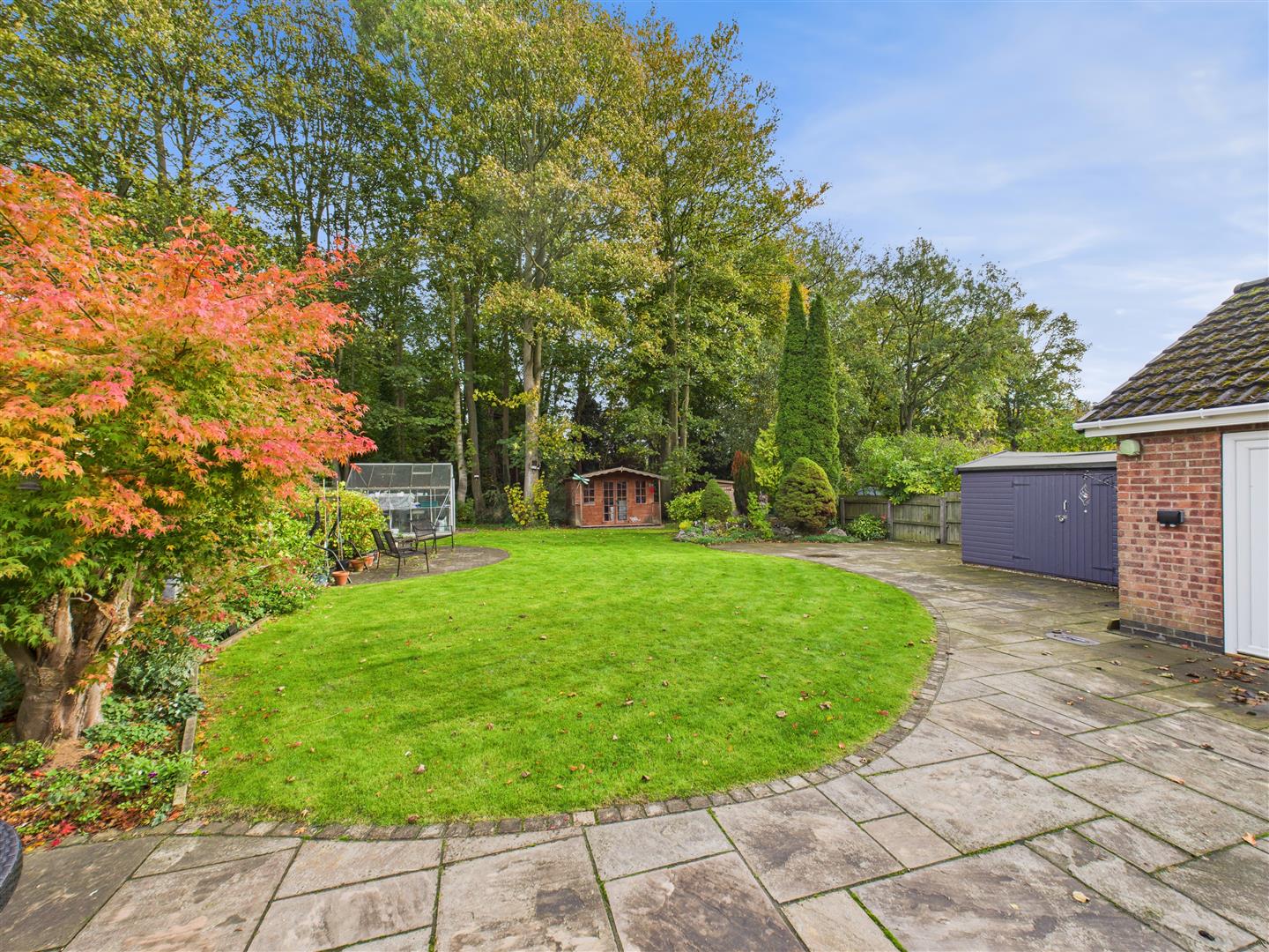 Outside - Externally, a lawned garden with mature shrub borders extends across the front. A double-width driveway provides extensive off-street parking and leads to the detached double garage with an automated door. The rear garden is a delight, featuring a shaped lawn, large patio areas, and a unique woodland section, complemented by a greenhouse, a summerhouse, and two sheds, creating an ideal outdoor haven for relaxation and leisure.