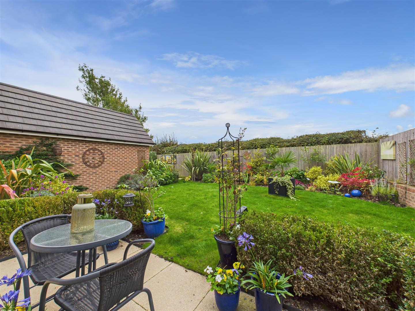 The rear garden is beautifully designed for enjoyment and relaxation. It features attractive, well-maintained landscaping, including paved patio areas, a neat lawn, and defined planting beds, all enclosed by perimeter fencing. There is also an external water tap. Crucially, the garden enjoys a highly sought-after south-facing aspect and adjoins local playing fields, ensuring the space is not directly overlooked. This provides a superb, private environment perfect for summer dining and entertaining.
