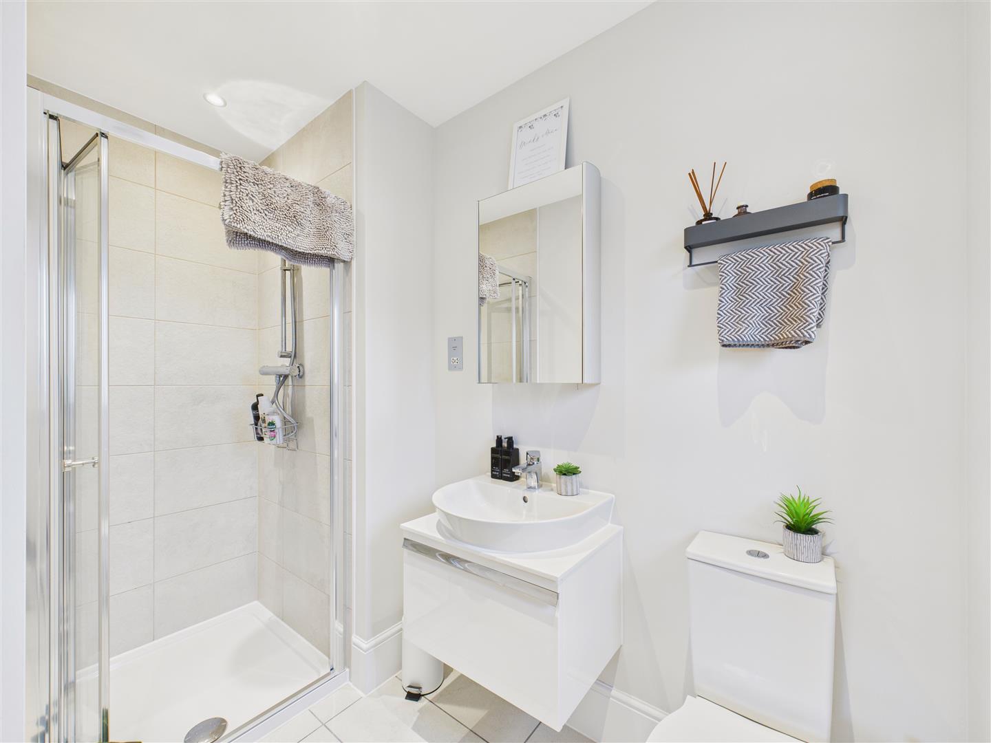 En-Suite Shower Room - With suite comprising a shower enclosure, vanity unit with wash hand basin and low flush W.C. Tiled floor, heated towel rail, inset spot lights and window to side.