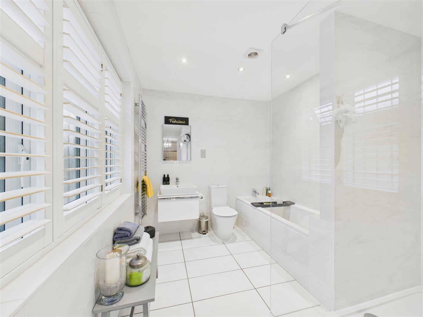 En-Suite Bathroom - With luxurious suite comprising a bath, walk in shower with rainhead and hand held shower system with Aqualisa Digital Control, vanity unit with wash hand basin with LED demister mirror above, and low flush W.C.. Fully tiled to walls and floor, inset spot lights, heated towel rail and window with plantation shutters to the front elevation.
