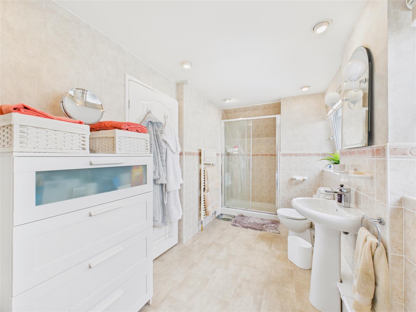 Bathroom - This space has been created by combining the original third bedroom and bathroom therefore adding a luxury feel to the bathroom. The suite comprises a corner bath, shower enclosure, wash hand basin and low flush W.C. Heated towel rail, part tiling to walls and windows to side.