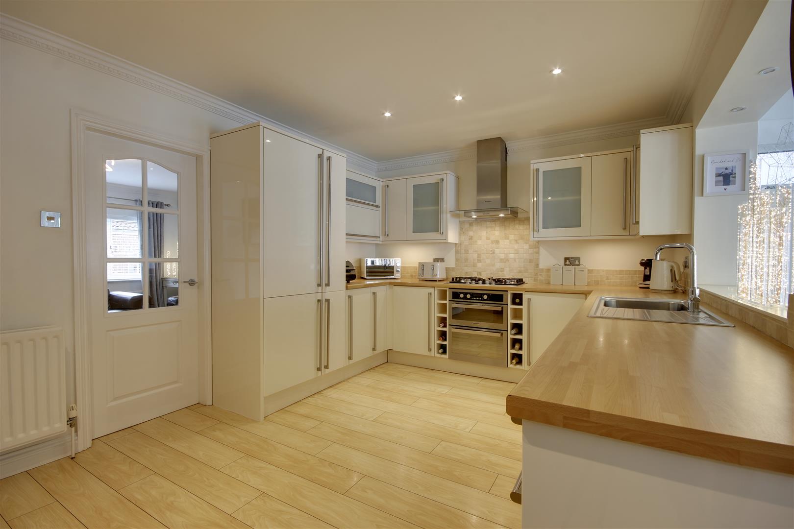 Dining Kitchen - 5.38m x 3.23m approx (17'8" x 10'7" approx) - Having a range of contemporary base and wall units with contrasting worksurfaces, sink and drainer with mixer tap, double oven, five ring gas hob with filter hood above, integrated fridge/freezer, dishwasher and washing machine. Inset spot lights. Open plan through to the garden room